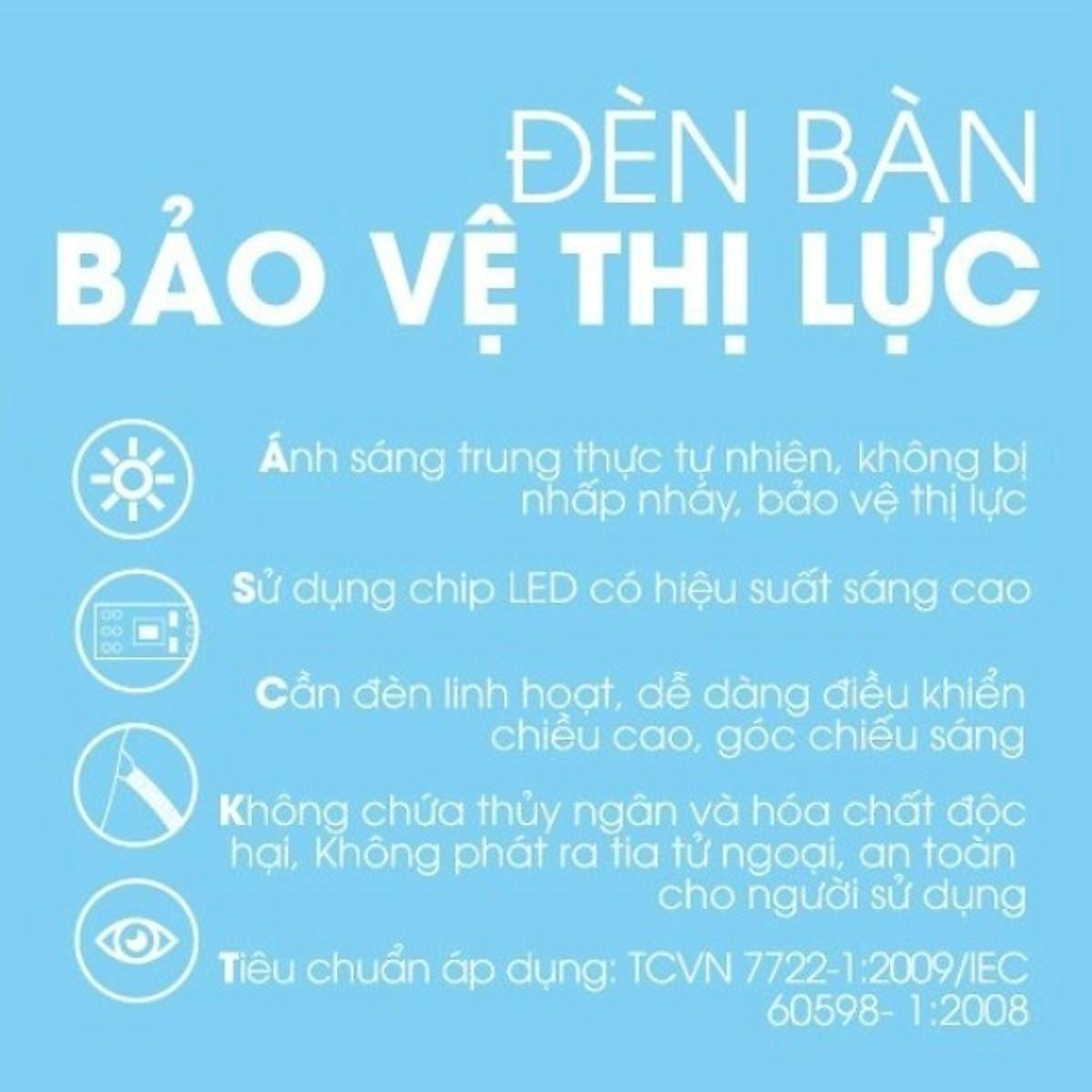 Công suất: 5W Điện áp: 220V/50Hz Màu ánh sáng: Trắng/Vàng Độ rọi: 700 lux - Đèn bàn LED Rạng Đông bảo vệ thị lực - Cần đèn linh hoạt điều chỉnh độ cao và góc