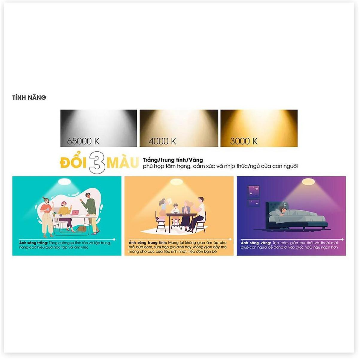 Công suất: 12W Điện áp: 220V/50Hz Quang thông: 930lm/910lm Nhiệt độ màu: 6500K/3000K Kích thước (ØxH): (138x50)mm ĐK lỗ khoét trần: 110mm - Sử dụng Chip LED Samsung đạt độ tin cậy cao - Chất