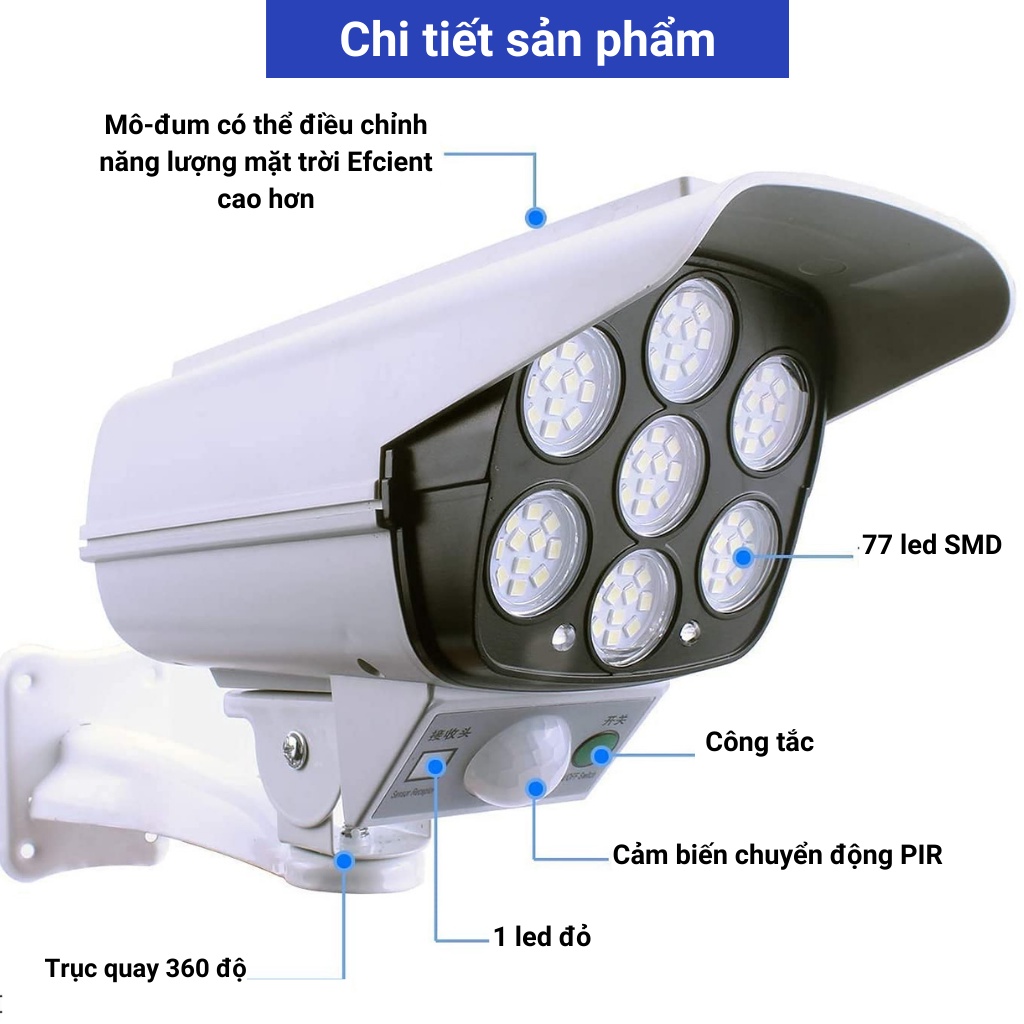 Đèn Năng Lượng Mặt Trời giả camera ngoài trời ️ Sạc năng lượng mặt trời, hóa đơn không tiền điện trong suốt năm ️ Tuổi thọ cao và dễ sử dụng ️ Máy ảnh được bắt chước để tránh trộm hiệu quả ️ Dễ dàng cài đặt ️ Chế độ chuyển đổi: Ba chế độ, Nhấn và giữ 3 giây để xoay một đèn, nhấn nhanh 1 giây để chế độ chuyển đổi Thông số kỹ thuật: ️ Tấm năng lượng mặt trời: Tối đa 5V 2W ️ Pin Li-ion: 3.7V 2600mAh ️ Số lượng đèn LED: 77led ️ Nhiệt độ màu: Trắng (6500K) ️ Độ trễ thời gian: 15-20 giây ️ Góc chuyển động: 120 độ ️ Khoảng cách chuyển động: 26 ft ️ Chế độ chuyển đổi: Ba chế độ, Nhấn và giữ 3 giây để xoay một đèn, nhấn nhanh 1 giây để chế độ chuyển đổi ️ Chất liệu: Nhựa ABS ️ Trọng lượng: 0.37 kg (0.81 lb) ️ Kích thước: 2099.5 cm (7.83.53.7 inch) ️ Nhiệt độ làm việc: -10-60 ℃(14 ℉-140 ℉)