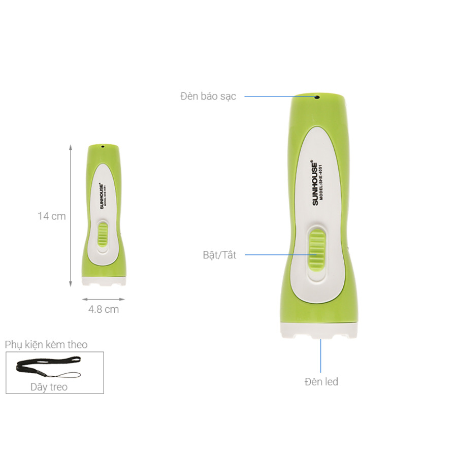 Đèn pin tay cầm Sunhouse SHE-4051 có hình trụ với độ dài vừa phải (140mm), dễ dàng cất gọn trong balo hay túi xách. Thân đèn bằng nhựa cao cấp siêu bền, cách nhiệt, màu sắc nổi bật.