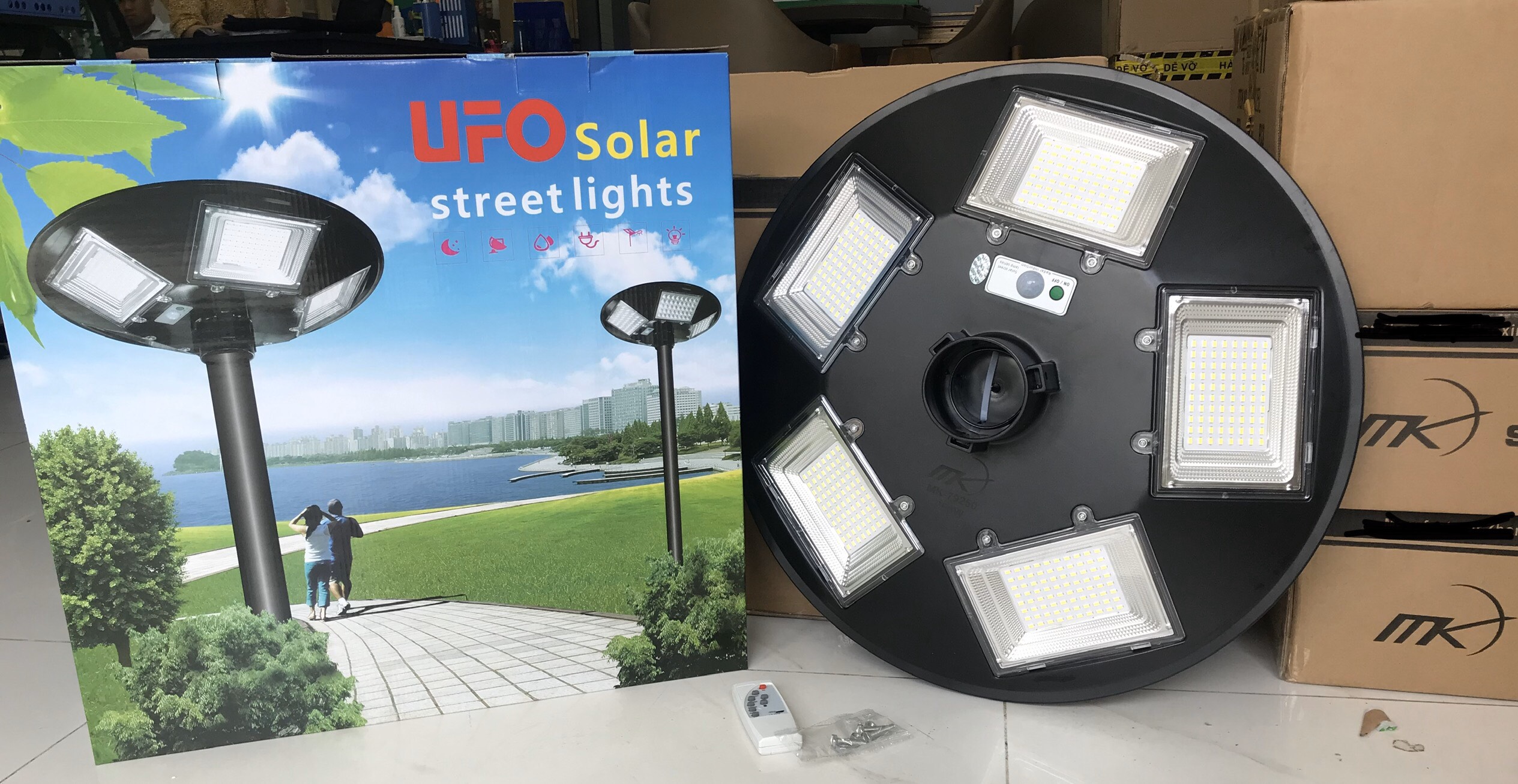 Đèn năng lượng mặt trời sân vườn, công viên UFO-500w-400 Chip Led. (5 ô) Đèn Đĩa Bay chuyên dùng trong các dự án lắp đặt đèn ở công viên, sân vườn, chung cư, bệnh viện…