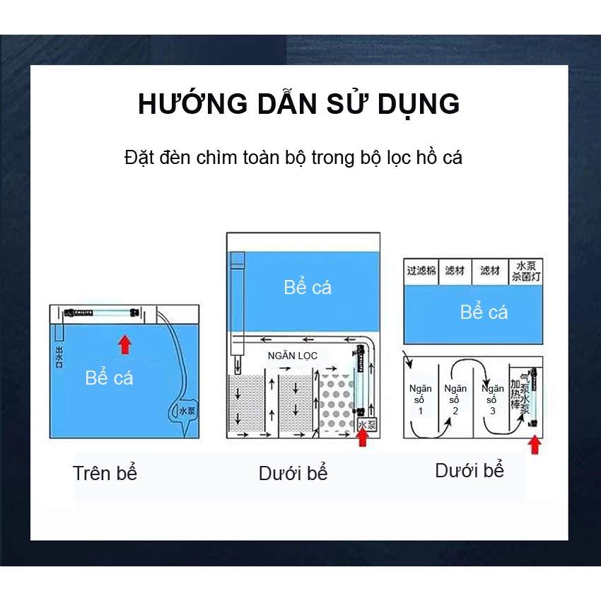 Công suấtDung tích bể (dưới)Chiều dài đènCân nặngKích thước hộp (DxRxC)20W2000L38cm1.45kg51x7.5x7.5cm30W3000L47cm1.65kg61x7.5x7.5cm40W4000L58cm1.85kg71x7.5x7.5cm55W5500L69cm2kg81x7.5x7.5cm75W7500L75cm2.45kg91x7.5x7.5cm100W10000L (10 khối)78cm2.45kg93.8x7.5x7.5cm150W15000L (15 khối)82cm2.45kg94x7.5x7.5cm200W20000L (20 khối)82cm2.5kg94x7.5x7.5cm