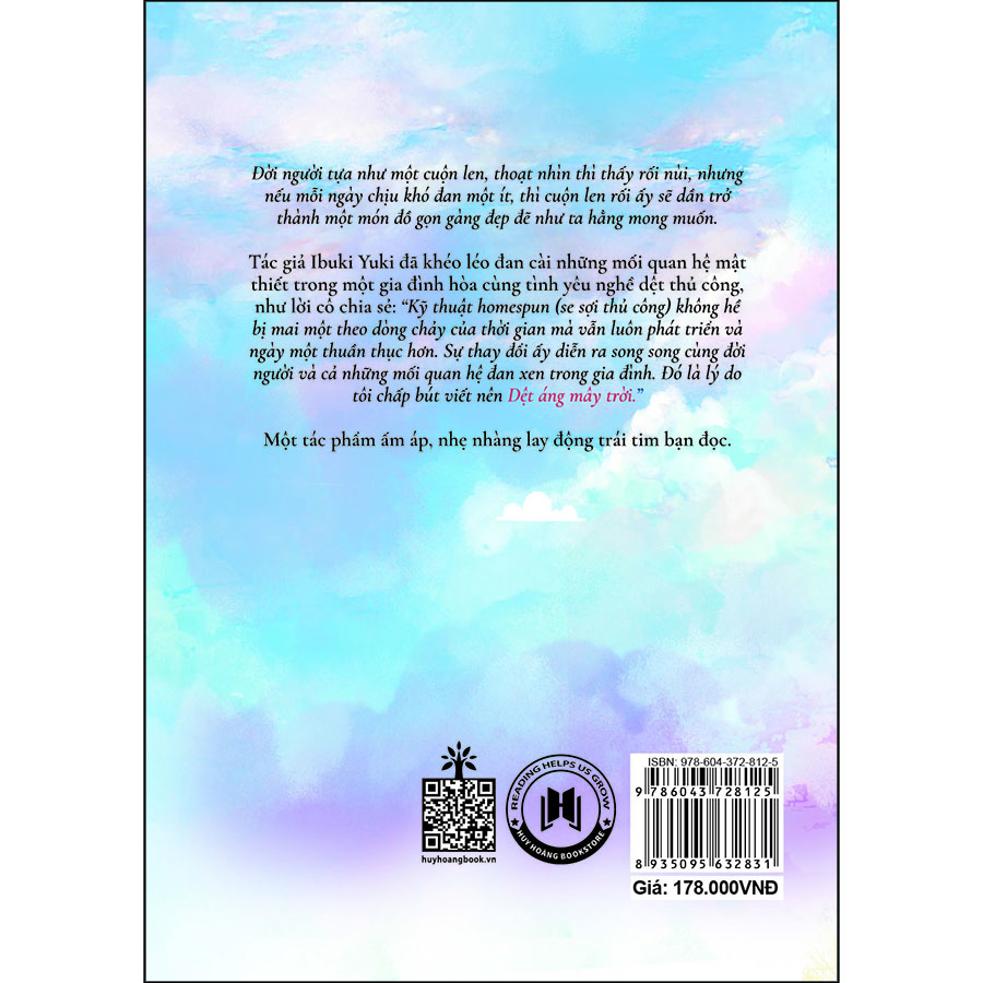 Tác giả Ibuki Yuki đã khéo léo đan cài những mối quan hệ mật thiết trong một gia đình hòa cùng tình yêu nghề dệt thủ công, như lời cô chia sẻ: “Kỹ thuật homespun (se sợi thủ công) không hề bị mai một theo dòng chảy của thời gian mà vẫn luôn phát triển và ngày một thuần thục hơn. Sự thay đổi ấy diễn ra song song cùng đời người và cả những mối quan hệ đan xen trong gia đình. Đó là lý do tôi chấp bút viết nên Dệt áng mây trời.”