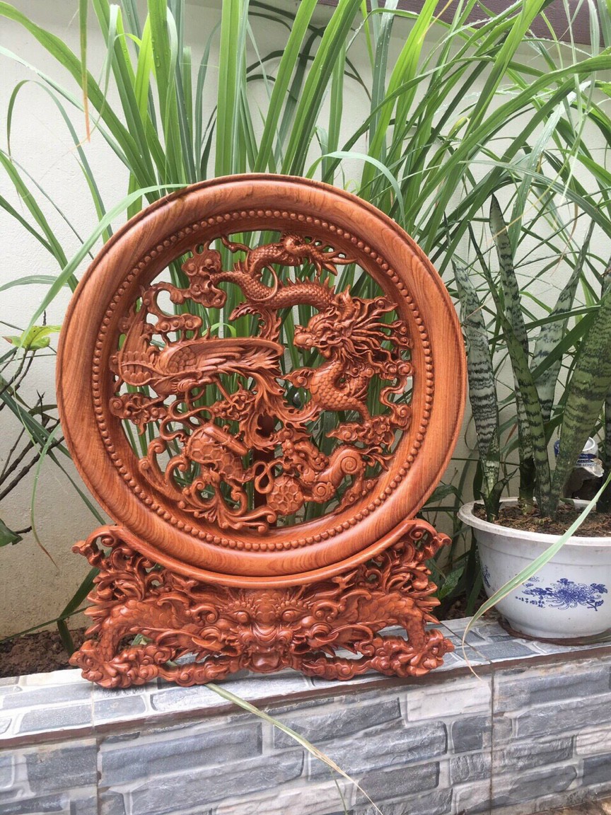 ✨Đĩa tranh trí phong thủy trạm khắc long ly quy phượng bằng gỗ hương đá kt mặt rộng 35×4cm