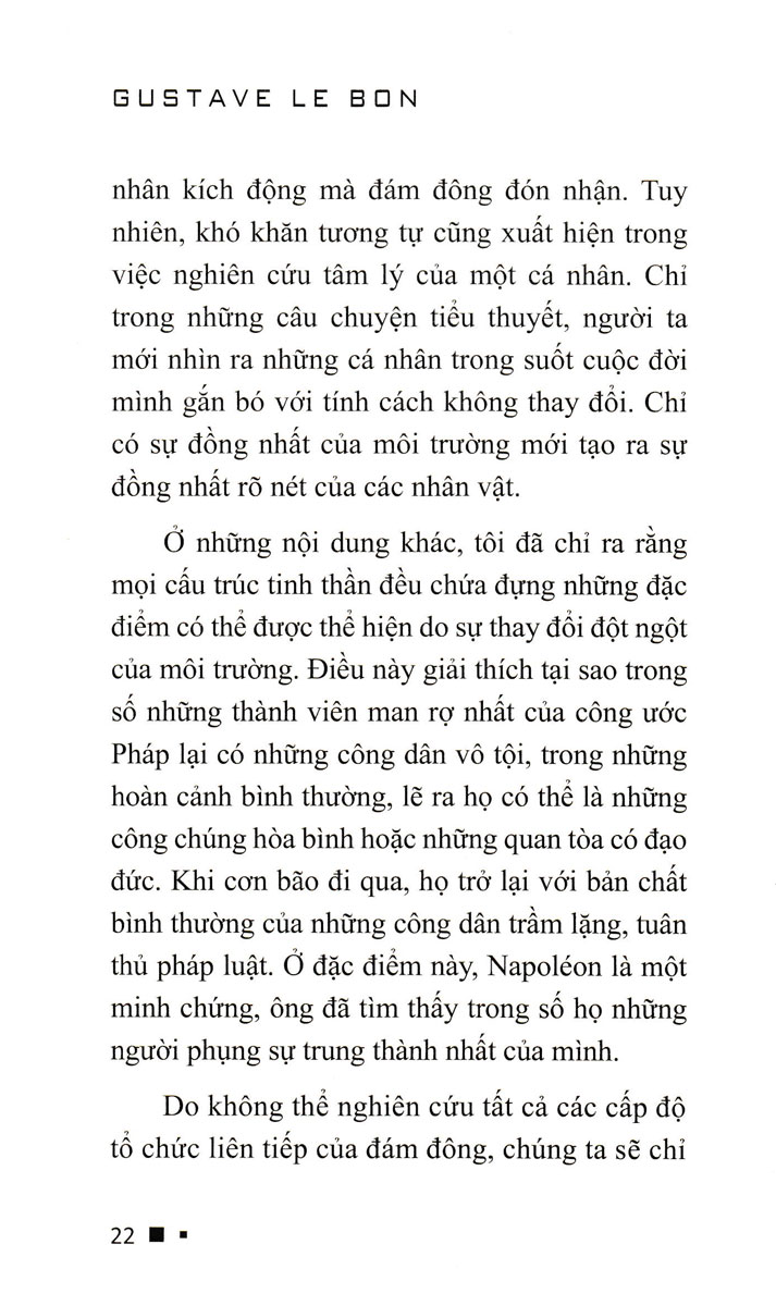 Đám đông có sức mạnh hủy diệt. Sự cai trị của họ mang tính man rợ. Một nền văn minh bao gồm các quy tắc, kỷ luật cố định, sự chuyển đổi từ trạng thái bản năng sang trạng thái lý trí, dự tính trước cho tương lai, trình độ văn hóa nâng cao – tất cả đều là những điều kiện mà đám đông luôn không có khả năng nhận ra.