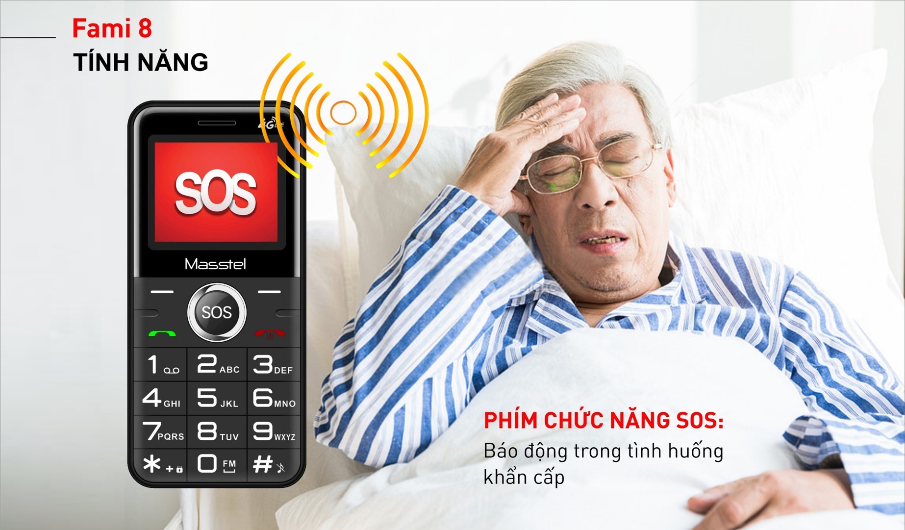 Là sản phẩm được thiết kế và chế tác dành riêng cho các bậc phụ huynh, đã trang bị thêm cho chiếc điện thoại Fami 8 một phím chức năng SOS chuyên dụng. Phím bấm này có tác dụng báo động trong các tính huống khẩn cấp và được đặt ở ngay giữa các phím điều hướng ở vị trí dễ thấy nhất. Khi được kích hoạt, phím SOS sẽ ra lệnh cho Fami 8 liên lạc qua số khẩn cấp thiết lập trước trong máy, thông báo cho người thân biết về tình trạng của chủ nhân thiết bị.