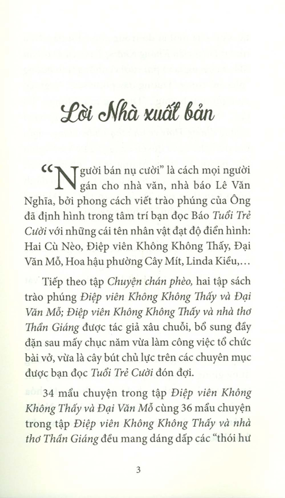 Bộ truyện trào phúng gồm hai cuốn của nhà văn: Điệp viên Không Không Thấy và nhà thơ Thần Giáng, Điệp viên Không Không Thấy và Đại Văn Mỗ gồm 34 mẩu chuyện, cùng 36 mẩu