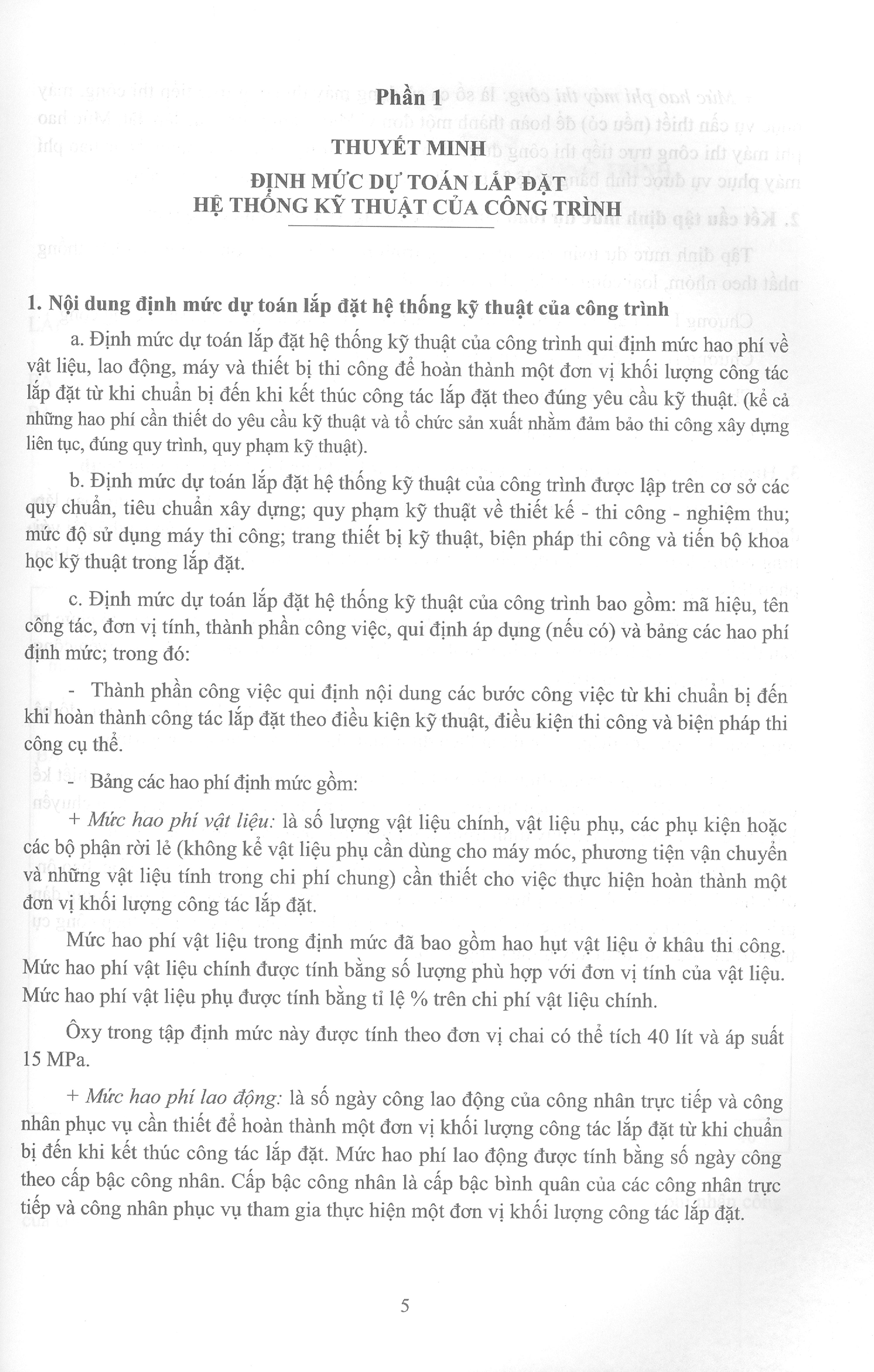 Định mức dự toán lắp đặt hệ thống kỹ thuật của công trình qui định mức hao phí về vật liệu, lao động, máy và thiết bị thi công để hoàn thành một đơn vị khối lượng công tác lắp đặt từ khi chuẩn bị đến khi kết thúc công tác lắp đặt theo đúng yêu cầu kỹ thuật, (kể cả những hao phí cần thiết do yêu cầu kỹ thuật và tổ chức sản xuất nhằm đảm bảo thi công xây dựng liên tục, đúng quy trình, quy phạm kỹ thuật).Định mức dự toán lắp đặt hệ thống kỹ thuật của công trình được lập trên cơ sở các quy chuẩn, tiêu chuẩn xây dựng; quy phạm kỹ thuật về thiết kế - thi công - nghiệm thu; mức độ sử dụng máy thi công; trang thiết bị kỹ thuật, biện pháp thi công và tiến bộ khoa học kỹ thuật trong lắp đặt.Định mức dự toán lắp đặt hệ thống kỹ thuật của công trình bao gồm: mã hiệu, tên công tác, đơn vị tính, thành phần công việc, qui định áp dụng (nếu có) và bảng các hao phí định mức; trong đó:Thành phần công việc qui định nội dung các bước công việc từ khi chuẩn bị đến khi hoàn thành công tác lắp đặt theo điều kiện kỹ thuật, điều kiện thi công và biện pháp thi công cụ thể.Bảng các hao phí định mức gồm:Mức hao phí vật liệu: là số lượng vật liệu chính, vật liệu phụ, các phụ kiện hoặc các bộ phận rời lẻ (không kể vật liệu phụ cần dùng cho máy móc, phương tiện vận chuyển và những vật liệu tính trong chi phí chung) cần thiết cho việc thực hiện hoàn thành một đơn vị khối lượng công tác lắp đặt.Mức hao phí vật liệu trong định mức đã bao gồm hao hụt vật liệu ở khâu thi công. Mức hao phí vật liệu chính được tính bằng số lượng phù hợp với đơn vị tính của vật liệu. Mức hao phí vật liệu phụ được tính bằng tỉ lệ % trên chi phí vật liệu chính.Ôxy trong tập định mức này được tính theo đơn vị chai có thể tích 40 lít và áp suất 15 MPa.Mức hao phí lao động: là số ngày công lao động của công nhân trực tiếp và công nhân phục vụ cần thiết để hoàn thành một đơn vị khối lượng công tác lắp đặt từ khi chuẩn bị đến khi kết thúc công tác lắp đặt. Mức hao phí lao động được tính bằng số ngày công theo cấp bậc công nhân, cấp bậc công nhân là cấp bậc bình quân của các công nhân trực tiếp và công nhân phục vụ tham gia thực hiện một đơn vị khối lượng công tác lắp đặt.
