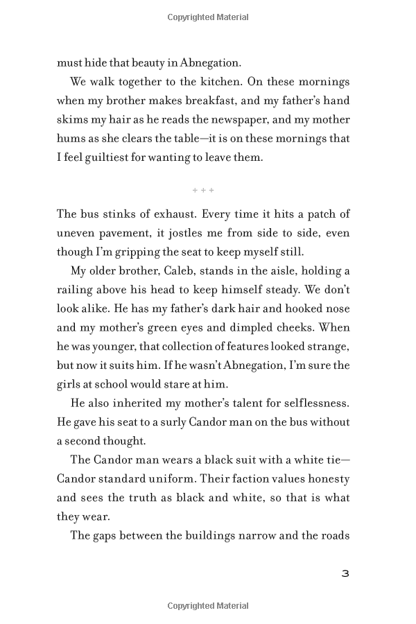 Roth: All the advantages I see only seem like advantages to me because I live in our current society. For example, the members of their society don’t focus on certain things: race, religion, sexual orientation, political affiliation, etc. I mean, a world in which you look different from the majority and no one minds? That sounds good to me. But when I think about it more, I realize that they’re doing the exact same thing we do, but with different criteria by which to distinguish ourselves from others. Instead of your skin color, it’s the color of your shirt that people assess, or the results of your aptitude test. Same problem, different system.