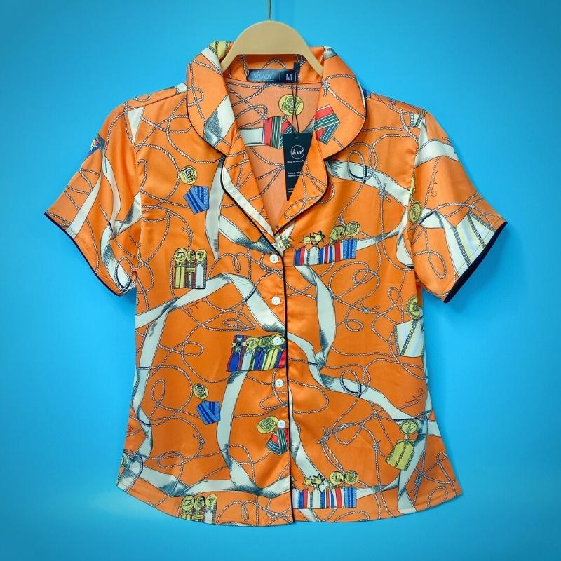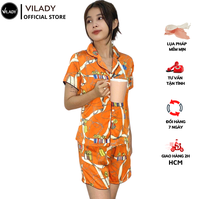 Đồ bộ Pyjama lụa, đồ mặc nhà nữ VILADY - B134 kiểu quần đùi tay cộc, họa tiết siêu dễ thương, chất liệu lụa Pháp ( lụa latin) - Màu cam