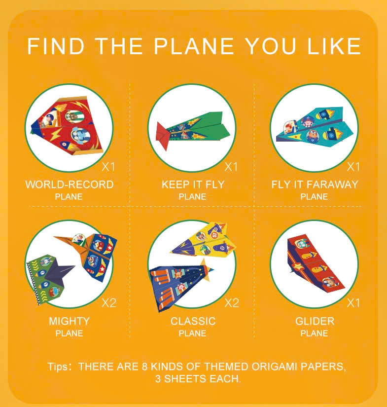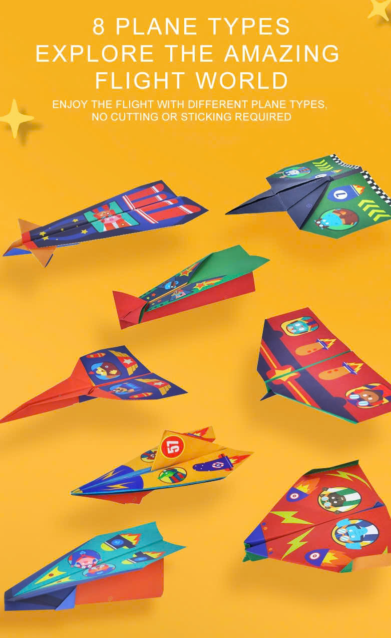 - 8 loại giấy gấp máy bay với 8 loại mô hình máy bay (3 tờ mỗi loại) – Tổng 24 tờ