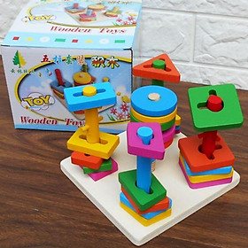 ✨Đồ Chơi Gỗ Luyện Tay Luồn Cọc Thông Minh - Thả Hình Khối Trên 5 Cột Trụ Đa Dạng Cho Bé