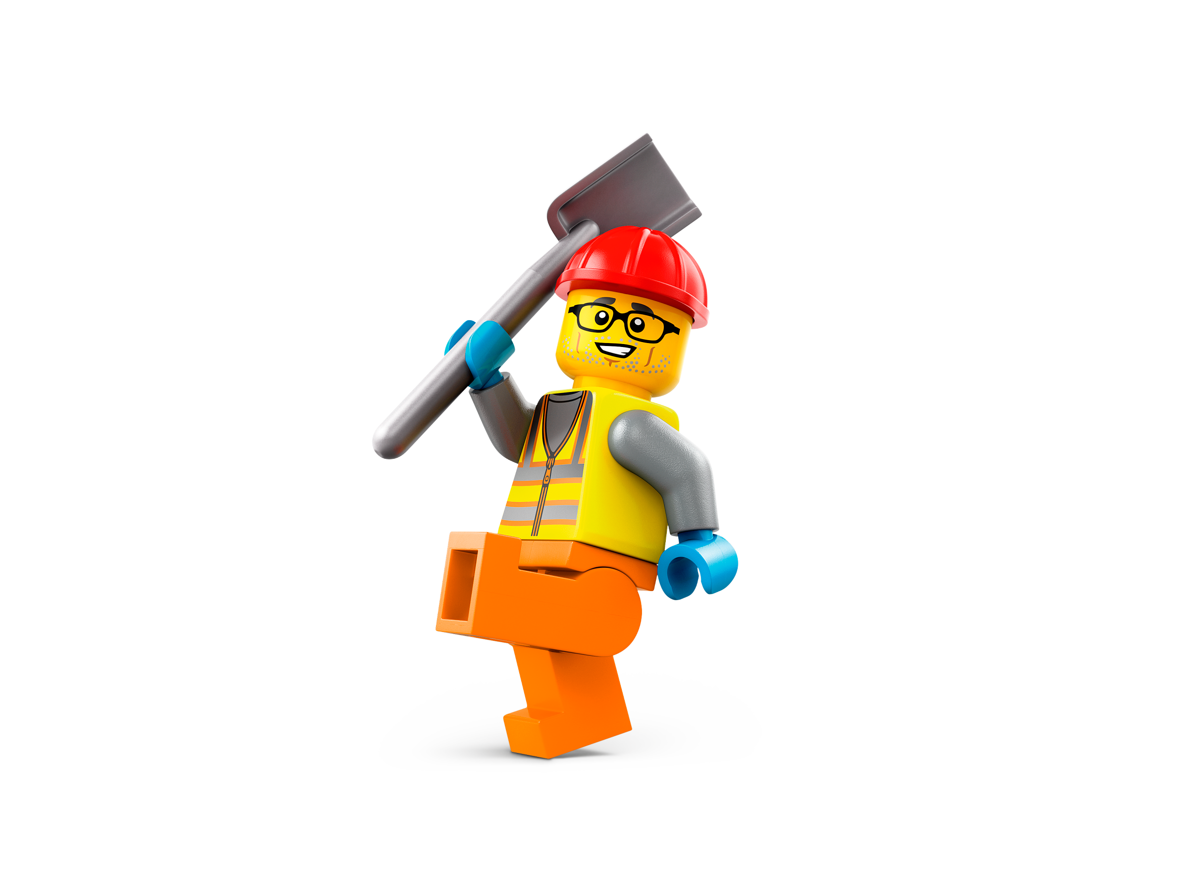 • Đồ chơi lắp ráp Xe lu công trình – Đồ chơi LEGO City với phần bánh xe lớn, cabin lái và đèn hiệu cảnh báo, cùng với mô hình của công nhân xây dựng với một cái xẻng và mũ bảo hiểm.
