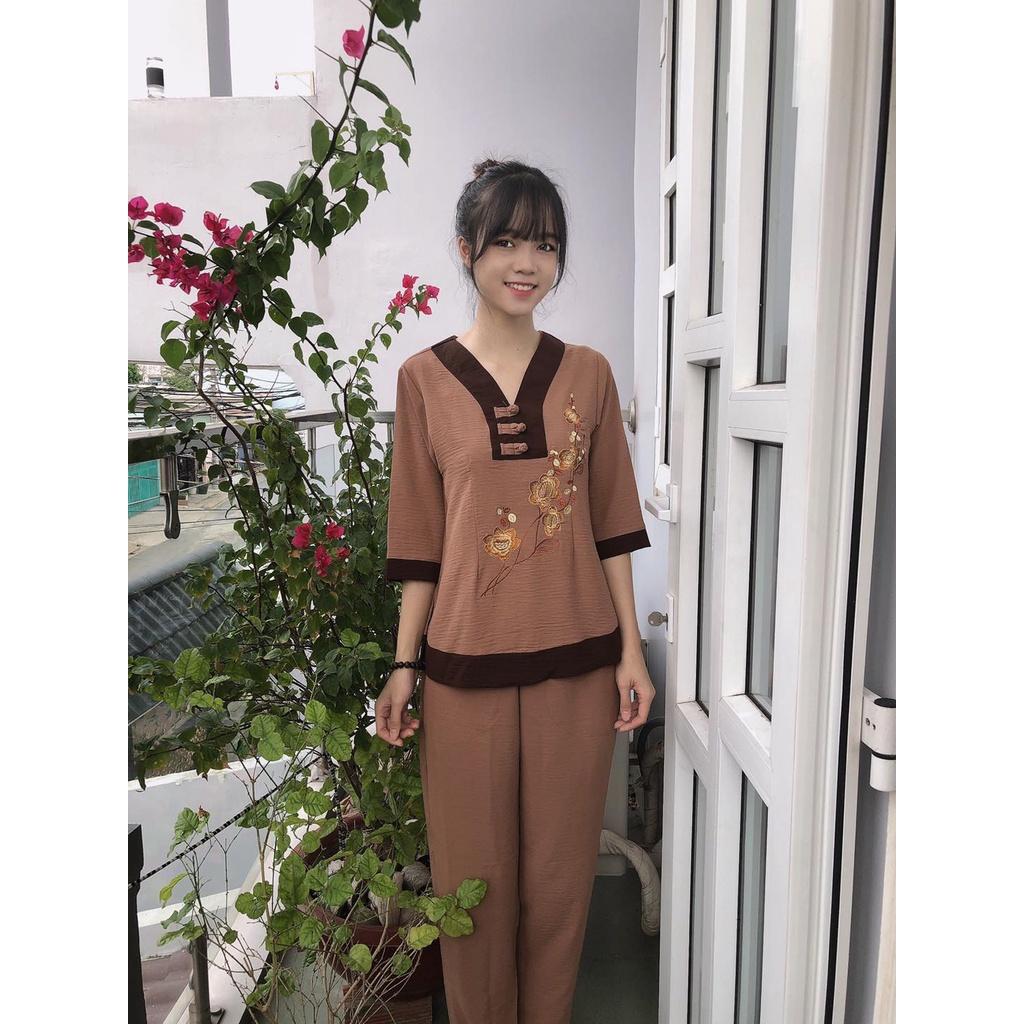 Đồ bộ đi chùa vải đủi vân may thêu hoa sen và chữ An