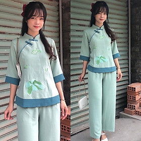 Đồ bộ đi chùa vải đủi vân may thêu hoa sen và chữ AN