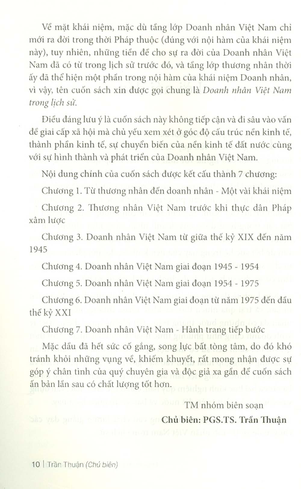 Doanh nhân Việt Nam trong lịch sử là một công trình nghiên cứu công phu, nghiêm túc của nhóm tác giả do PGS - TS Trần Thuận chủ biên. Cuốn sách ngoài chương 1 có tính lý luận và chương 6 mang tính khái quát, nêu bật những đặc điểm cơ bản của doanh nhân Việt Nam từ trước đến nay, 5 chương còn lại, mỗi chương đề cập đến doanh nhân Việt Nam trong mỗi thời đoạn lịch sử với tình hình cụ thể của đất nước, giúp người đọc nhận thức đầy đủ hơn tính chất và đặc điểm của doanh nhân nước nhà. Điều đáng lưu ý là cuốn sách này không tiếp cận và đi sâu vào vấn đề giai cấp xã hội mà chủ yếu xem xét ở góc độ cấu trúc nền kinh tế, thành phần kinh tế, sự chuyển biến của nền kinh tế đất nước cùng với sự hình thành và phát triển của doanh nhân Việt Nam. Cuốn sách được kết cấu thành 7 chương trải dài thành câu chuyện kể liền mạch: Từ thương nhân đến doanh nhân - Một vài khái niệm, Thương nhân Việt Nam trước khi thực dân Pháp xâm lược, Doanh nhân Việt Nam từ giữa thế kỷ XIX đến năm 1945, Doanh nhân Việt Nam giai đoạn 1945 – 1954, Doanh nhân Việt Nam giai đoạn 1954 – 1975, Doanh nhân Việt Nam giai đoạn từ năm 1975 đến đầu thế kỷ XXI, Doanh nhân Việt Nam - Hành trang tiếp bước.