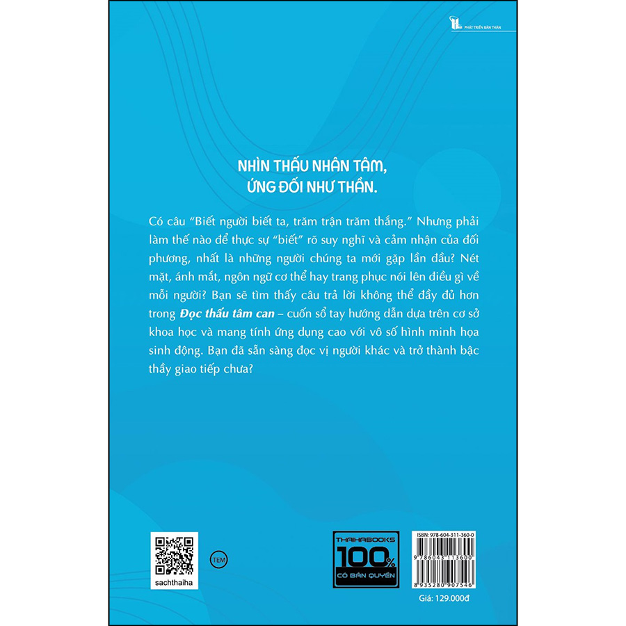 Đọc vị người khác cũng giống như đọc một cuốn sách thi thoảng lại có một vài đoạn viết bằng tiếng nước ngoài. Khi tương tác với đối phương, chúng ta thường tưởng rằng mình hiểu họ đang nghĩ gì. Song trên thực tế, họ lại thực hiện những việc khác hẳn, khiến chúng ta thấy rối trí và tổn thương. Một số vết rạn nứt trong giao tiếp như vậy xảy ra do đối phương cố tình lừa gạt chúng ta. Nhưng lý do chủ yếu là vì người đó không biết chính họ đang nghĩ gì hoặc tại sao họ lại thực hiện một hành động nhất định. Đây chính là lúc chúng ta nhận ra sự hữu ích của việc tìm hiểu về thứ ngôn ngữ thể hiện qua cơ thể, nét mặt, và đôi khi cả những hành vi tưởng chừng rất phi lý. Đọc thấu tâm can là cuốn sách giúp bạn tìm hiểu về ngôn ngữ đó. Thông qua những dấu hiệu trên cơ thể một người, bạn sẽ thấy được những trải nghiệm sống của họ. Ngoài ra, sau khi phân tích nét mặt hay cử chỉ, bạn sẽ thấu hiểu cảm xúc và ý định thực sự của đối phương. Cuốn sách cũng trình bày một số cơ chế tâm lý và sinh học tác động đến con người, khiến họ có những cách hành xử phức tạp. Hầu hết các cơ chế này đều hoạt động dưới dạng tiềm thức. Thực ra, phần lớn những gì chúng ta nghĩ và làm đều thuộc về tiềm thức. Có lẽ từ kinh nghiệm cá nhân, chúng ta đều biết rằng mình có thể thực hiện một số việc tương đối phức tạp – chẳng hạn lái xe về nhà hay ngân nga một bài hát quen thuộc – trong vô thức. Những nghiên cứu gần đây về tiềm thức cho thấy nó còn có khả năng vạch ra những kế hoạch phức tạp và dài hạn, sau đó tự triển khai chúng, mặc dù chủ thể không nhận thức được điều đó. Trong một nghiên cứu, một nhóm người tham gia được thông báo (theo cách khiến họ không nhận ra mình vừa biết được thông tin) về cách hợp tác trước khi tham gia vào một trò chơi tương tác phức tạp và kéo dài. Kết quả, nhóm này lại hợp tác tốt hơn nhóm không được thông báo về việc phải phối hợp khi chơi. Khả năng phân biệt giữa bạn và thù đã giúp loài người sống sót trong buổi đầu của lịch sử, chúng ta đánh giá về người khác trước cả khi thấu hiểu họ. Khi tìm hiểu về lý do và cách thức hiện tượng này xảy ra, chúng ta có thể học được cách sử dụng bản năng này mà không lạm dụng nó. Việc nắm rõ những bài học này càng trở nên thiết yếu khi con người tập hợp lại thành một nhóm hoặc đám đông, đặc biệt là trong những tình huống cực đoan, khi tâm lý nhóm hoặc tâm lý bầy đàn thống trị. Cuốn Đọc thấu tâm can không nhằm giải thích đầy đủ và tường tận về hành vi của con người (thực ra, đây là nhiệm vụ bất khả thi), nhưng sẽ cung cấp một loạt các công cụ giúp bạn tự tìm ra lời giải cho riêng mình. Việc đọc vị người khác bao giờ cũng đòi hỏi tinh thần cẩn trọng, nhưng khi tốc độ giao tiếp trong thế giới hiện đại ngày càng nhanh hơn, thì các công cụ được bàn đến trong cuốn sách này cũng ngày càng quan trọng hơn bao giờ hết. Tác giả: Rita Carter là một tác giả chuyên viết về đề tài khoa học và y học với nhiều giải thưởng danh giá, ngoài ra bà còn là giảng viên và người dẫn chương trình chuyên về các đề tài liên quan đến não bộ con người: nó làm gì, nó vận hành như thế nào, và vì sao. Bà là tác giả của cuốn sách Mind Mapping (tạm dịch: Sơ đồ tư duy), và là người dẫn chương trình của một series các bài giảng về khoa học thường thức cho khán giả đại trà. Rita hiện đang sống ở Vương quốc Anh. Mục lục: ĐỐI MẶT