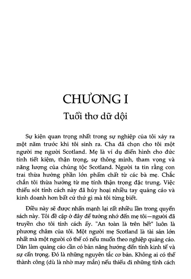 Quyển sách viết về những chiến dịch quảng cáo thực tiễn mà tác giả đã thực hiện cho các thương hiệu nổi tiếng như Palmolive, Pepsodent, Schlitz,… Đây là trải nghiệm thực tế nên không hề hàn lâm.