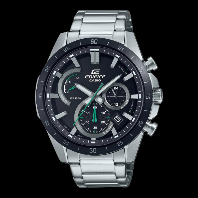 Các tính năng Đồng hồ ghi thời gian chạy bằng năng lượng mặt trời mới này có mặt số sợi carbon tượng trưng cho chủ đề đua xe thể thao của dòng sản phẩm EDIFICE.