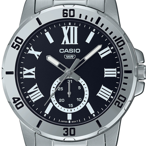 Đồng hồ Casio MTP-VD200BL-5BUDF thuộc Casio nam với dây da, nhiều kim, chống nước, mặt số la mã.