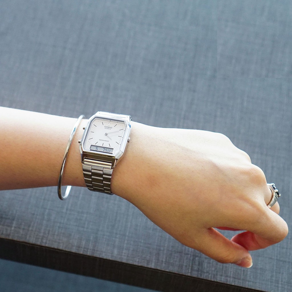 Review đồng hồ Casio nữ AQ-230A-7AMQYDF mặt vuông Vintage, kết hợp giữa điện tử và kim truyền thống