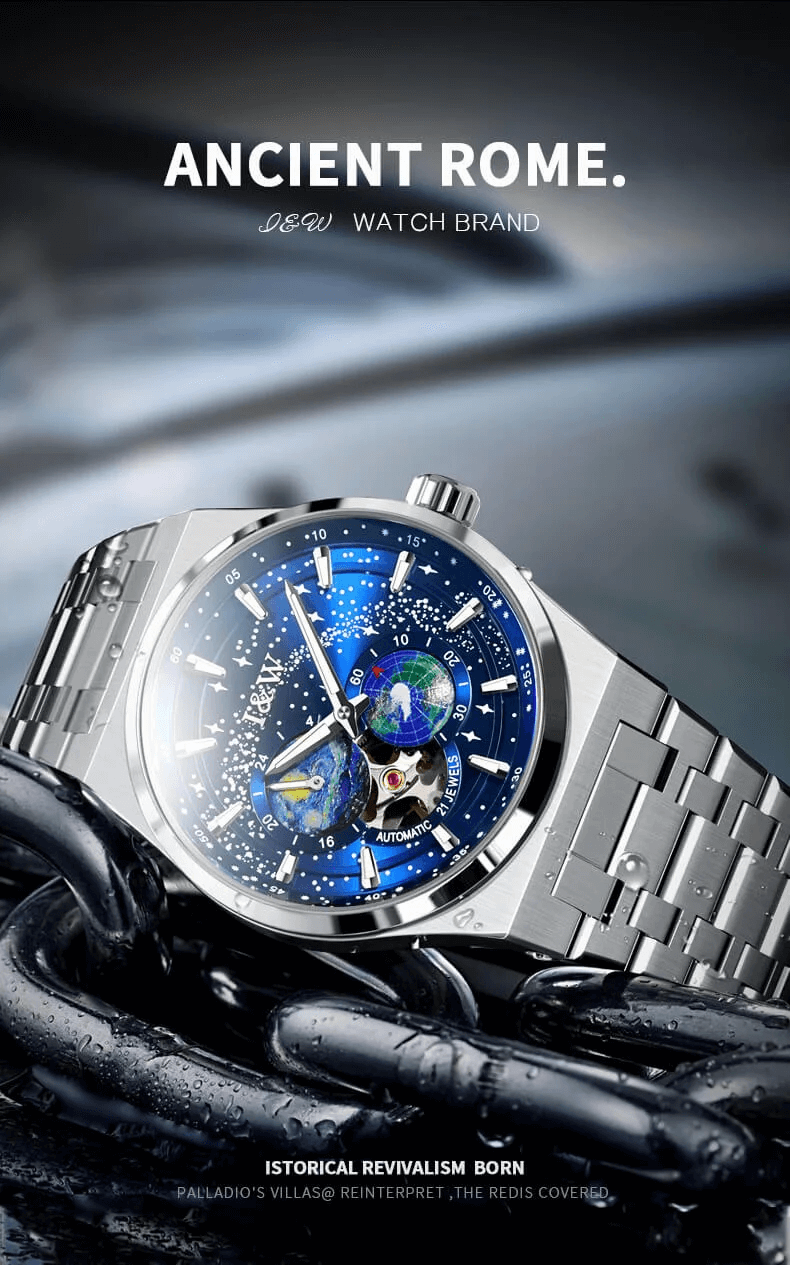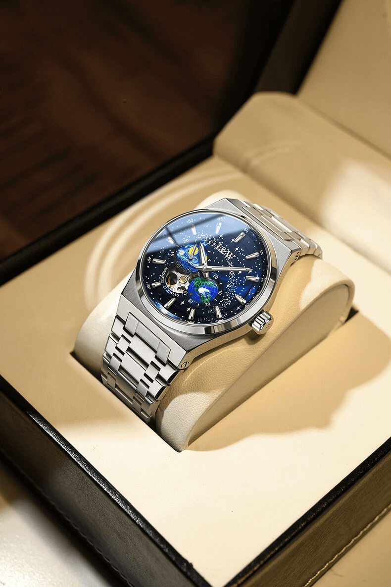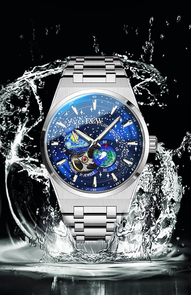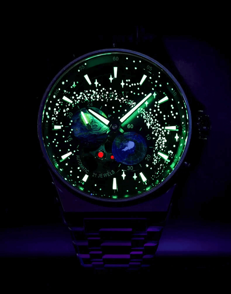 Sự kết hợp hoàn hảo đến khó tin của mặt dial vạn vì sao lấp lánh như bầu trời trong đêm cùng với sự sáng tạo kim giây mô phỏng vòng quay của Trái Đất không ngừng nghỉ (đặc sắc hơn với dạ quang siêu sáng ban đêm)