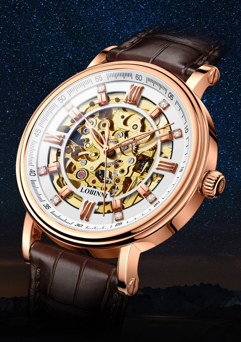 ❏ Vàng hồng 18K: Là vàng nguyên khối, phủ trọn gần như là toàn bộ mặt số đồng hồ LOBINNI L9010-2. Trong khi đó, sự sang trọng lại được kết hợp với nền tảng Skeleton độc đáo, giúp các quý ông chìm đắm ở cả mặt trước lẫn mặt sau thiết kế.