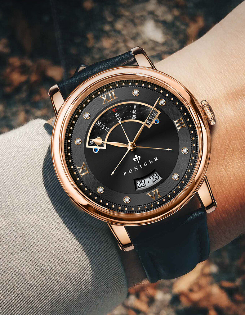 Đồng hồ Thụy Sĩ luôn mang lại cho người dùng một khoái cảm đặc biệt về cả diện mạo lẫn chất lượng. Như chiếc Poniger này, đẳng cấp thể hiện qua dòng chữ "SWISS MADE" được in trên mặt số. Bên cạnh đó còn là: