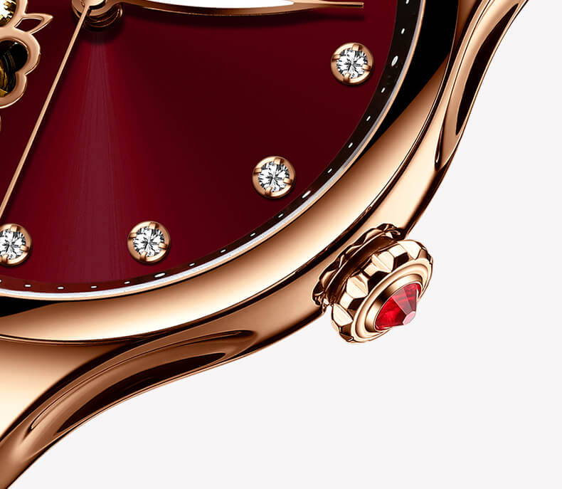 +Thiết kế hở tim phá cách kết hợp khéo léo với hoạ tiết hoa 4 cánh, viền mạ vàng PVD, cùng dây da màu đỏ thanh lịch sẽ khiến bạn nhận được sự "nể phục" vì gu chọn đồng hồ, cách chơi đồng hồ của mình !