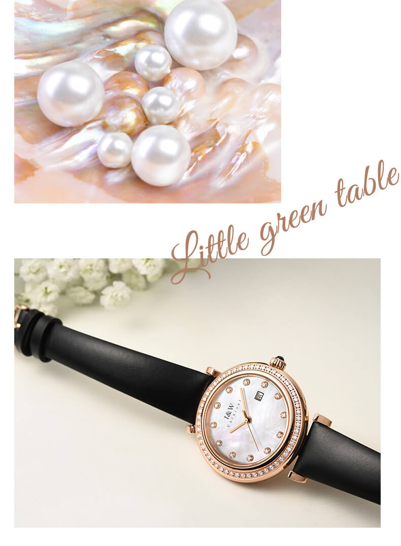 - Viền và mặt số đính đá quý kết hợp với mặt ngọc trai tạo nên giá trị của chiếc đồng hồ.