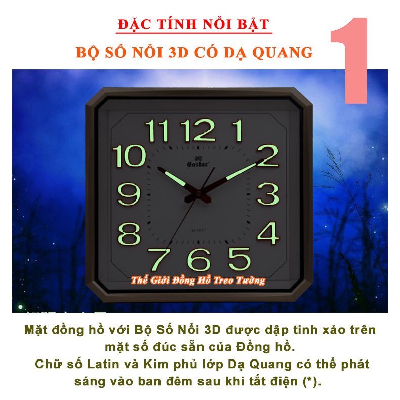 1. ĐẶC ĐIỂM NỔI BẬT: - Đồng hồ Treo tường Cao Cấp EASTAR Kim Trôi Nhật có Dạ quang (*), mặt vuông vát góc, kích thước 34,5 x 34, dày 5 cm. - Kiểu