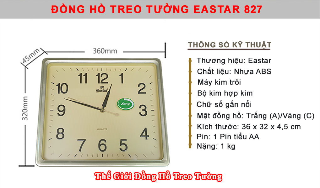 1. ĐẶC ĐIỂM NỔI BẬT: - Đồng hồ Treo tường Cao Cấp EASTAR KIM TRÔI NHẬT có Dạ quang (*), mặt vuông vát góc, kích thước 34,5 x 34, dày 5 cm. - Kiểu dáng