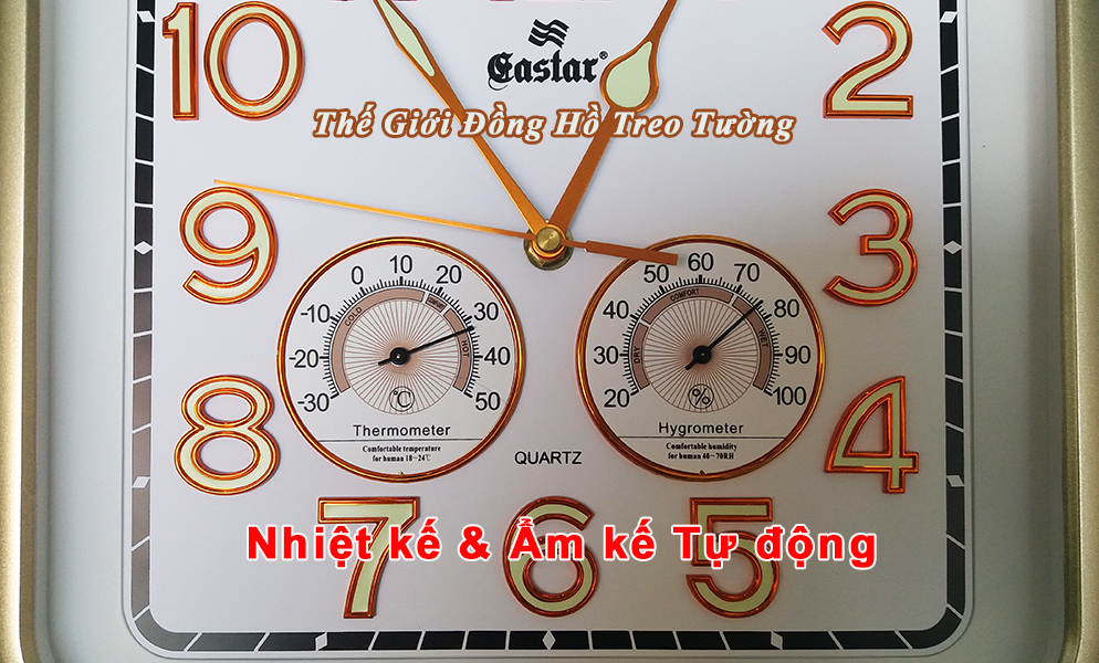(*) Nhiệt ẩm kế tự động sử dụng nguyên lý co dãn của lò so kim loại dựa trên điều kiện thời tiết để hiển thị nhiệt độ và độ ẩm xung quanh nơi treo đồng hồ. Không nên sử dụng cho mục đích khác. Đây cũng không phải là dụng cụ nhiệt ẩm kế chuyên dụng. Mức sai số của Nhiệt kế là ± 2oC. Mức sai số của Ẩm kế là ± 10%.