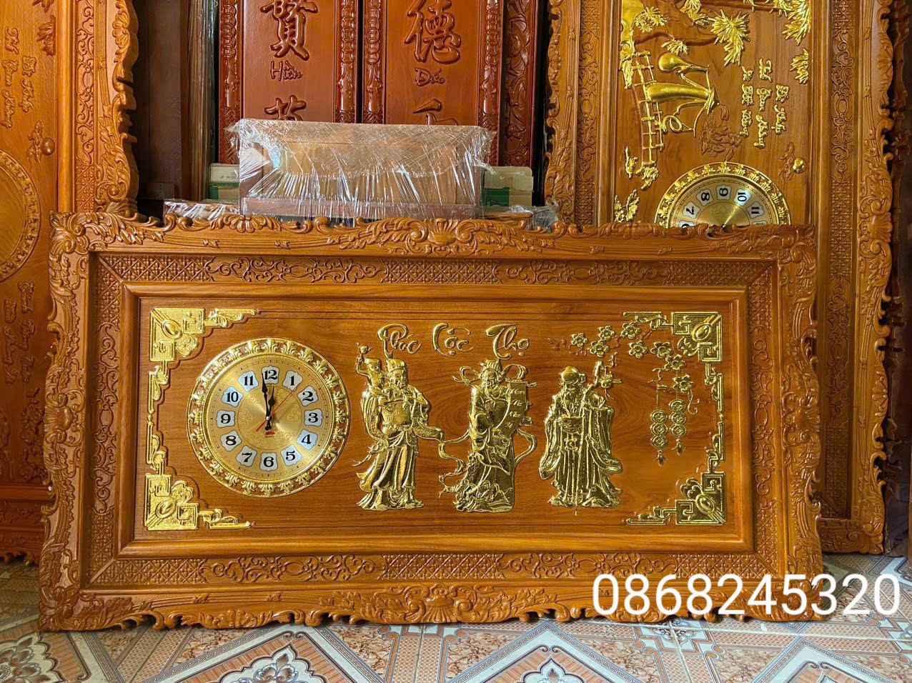 Mua tại Tiktok_ Đồng hồ treo tường khắc tích phúc lộc thọ được làm bằng chất liệu gỗ gõ đỏ tự nhiên 100% Và được sơn pu dát vàng cao cấp