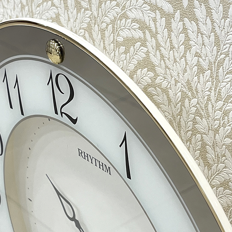 Đồng hồ treo tường Nhật Bản Rhythm CMG876NR18, dùng pin (AA x 1), vỏ nhựa màu vàng / kết hợp mạ vàng sang trọng. Kích thước 31.5 x 4.5cm, trọng lượng 625g. Máy kim trôi