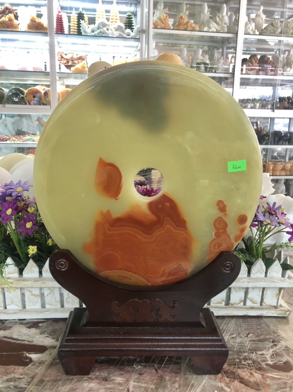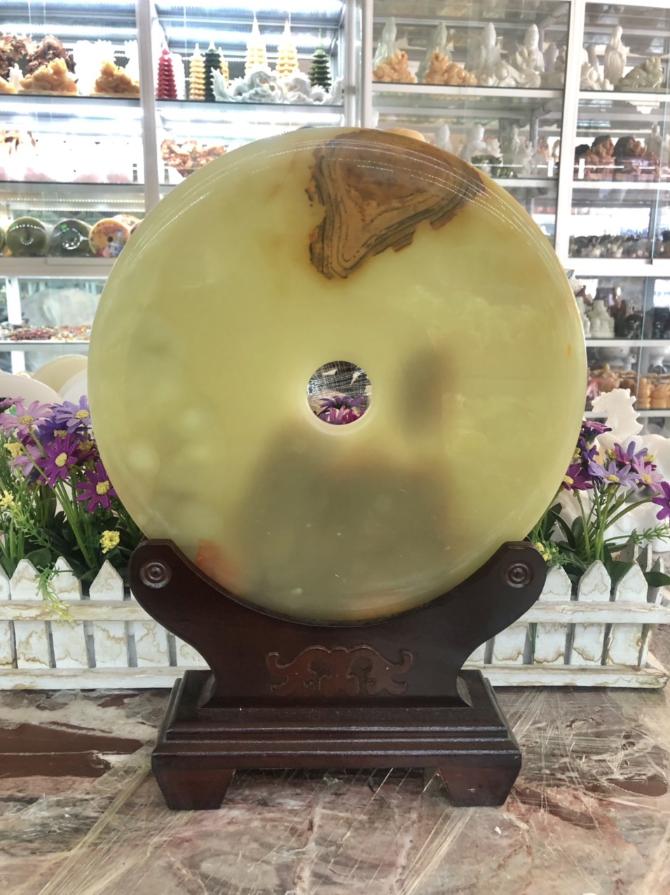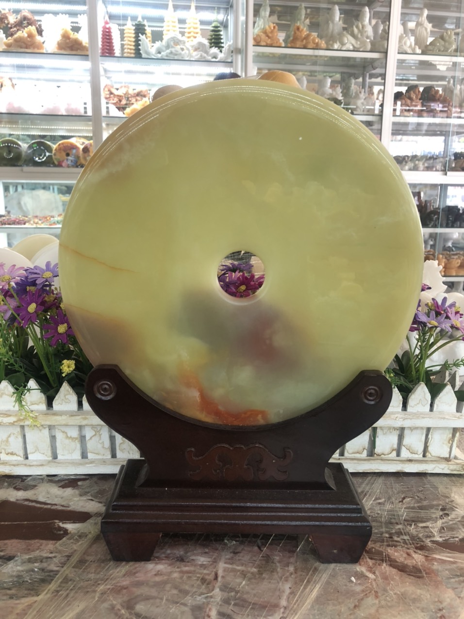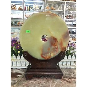 Chất liệu: Đá ngọc Onyx Kích thước: Đường kính 26 cm Khối lượng: 2,7 kg Từ thời xưa xưa, tiền xu được sử dụng với hình dạng tròn tượng trưng cho trời, giữa là hình
