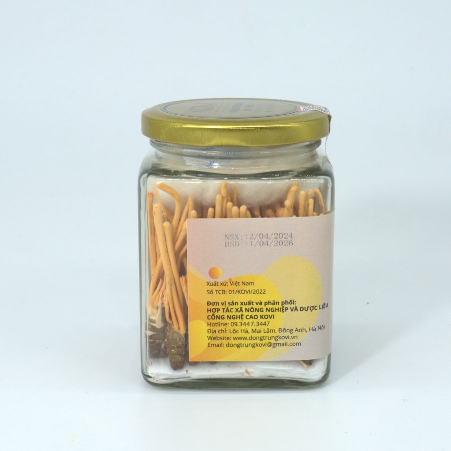 Đông Trùng Hạ Thảo Ký chủ nhộng tằm cao cấp KOVI được đựng trong lọ thủy tinh cao cấp gồm thành phần 100% sợi đông trùng hạ thảo sấy thăng hoa.