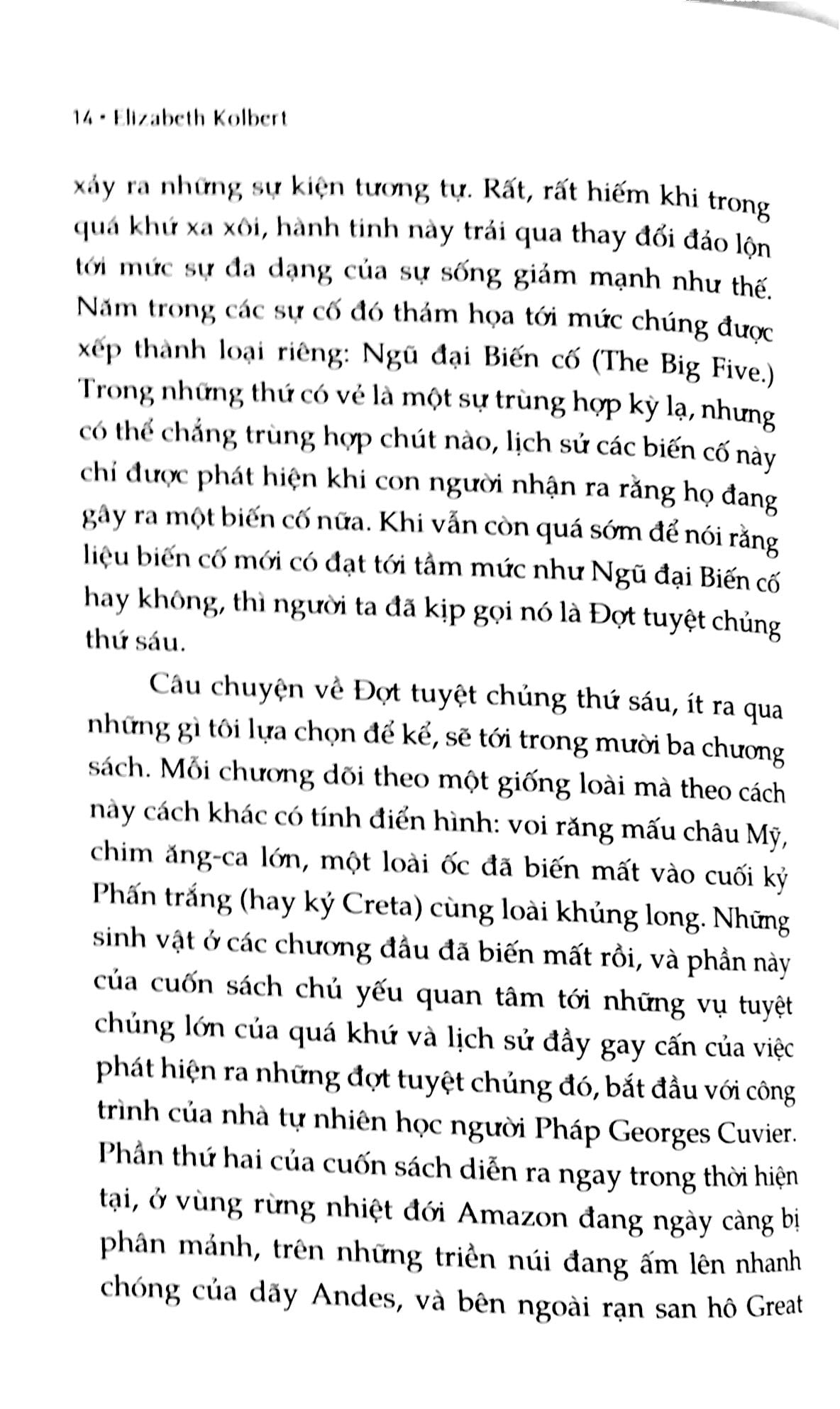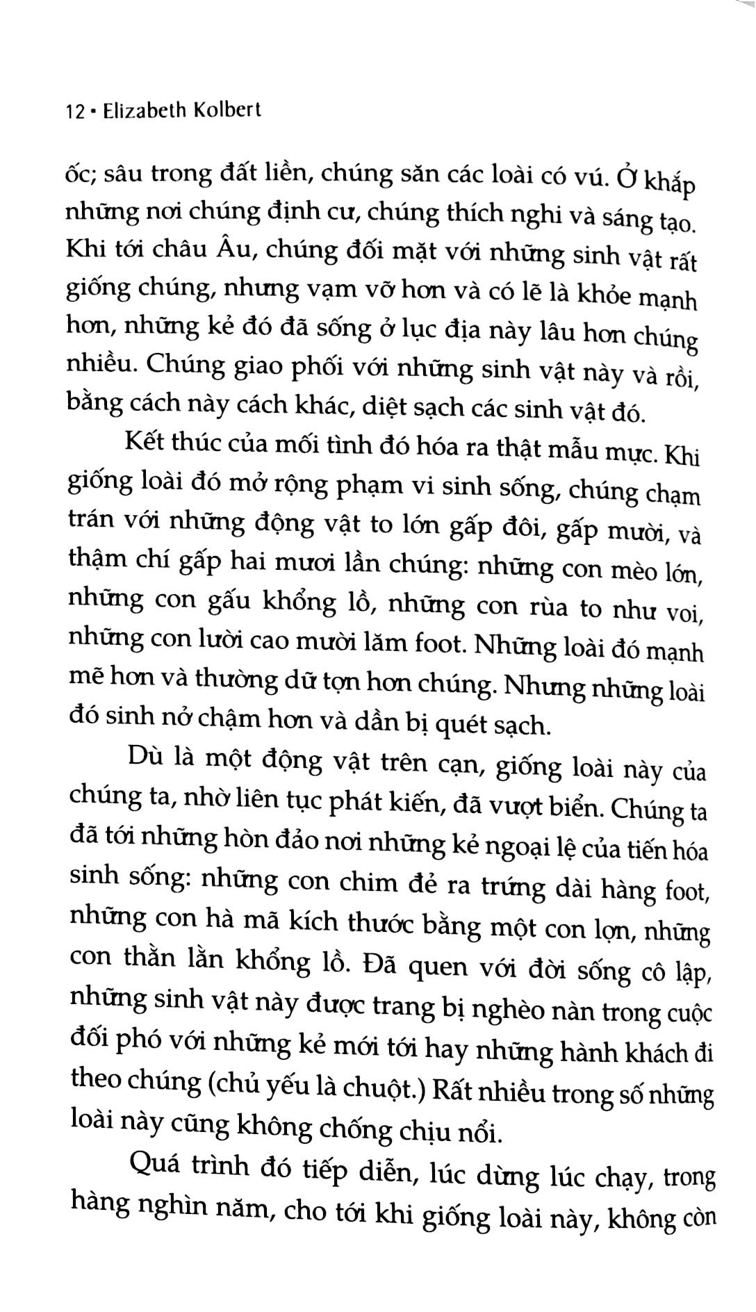Để trả lời nghi vấn này, ELIZABETH KOLBERT đã theo chân các nhà khoa học khảo sát sự tồn tại và xác nhận sự biến mất một số loài ở khắp các vùng trên trái đất. Từ loài ếch vàng ở Panama đến loài voi răng mấu châu Mỹ; từ lũ chim ăng-ca khờ khạo đến loài cúc đá nhỏ bé.