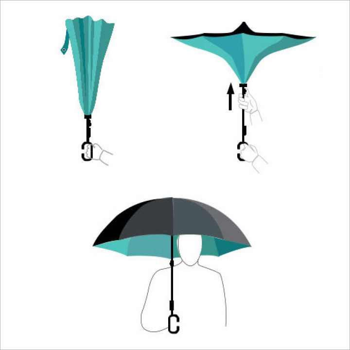 Thiết kế đột phá, mở và đóng theo chiều ngược lại so với ô truyền thống. Tối ưu hóa khả năng chắn nước, nhất là trong không gian hẹp. Nước được giữ lại bên trong