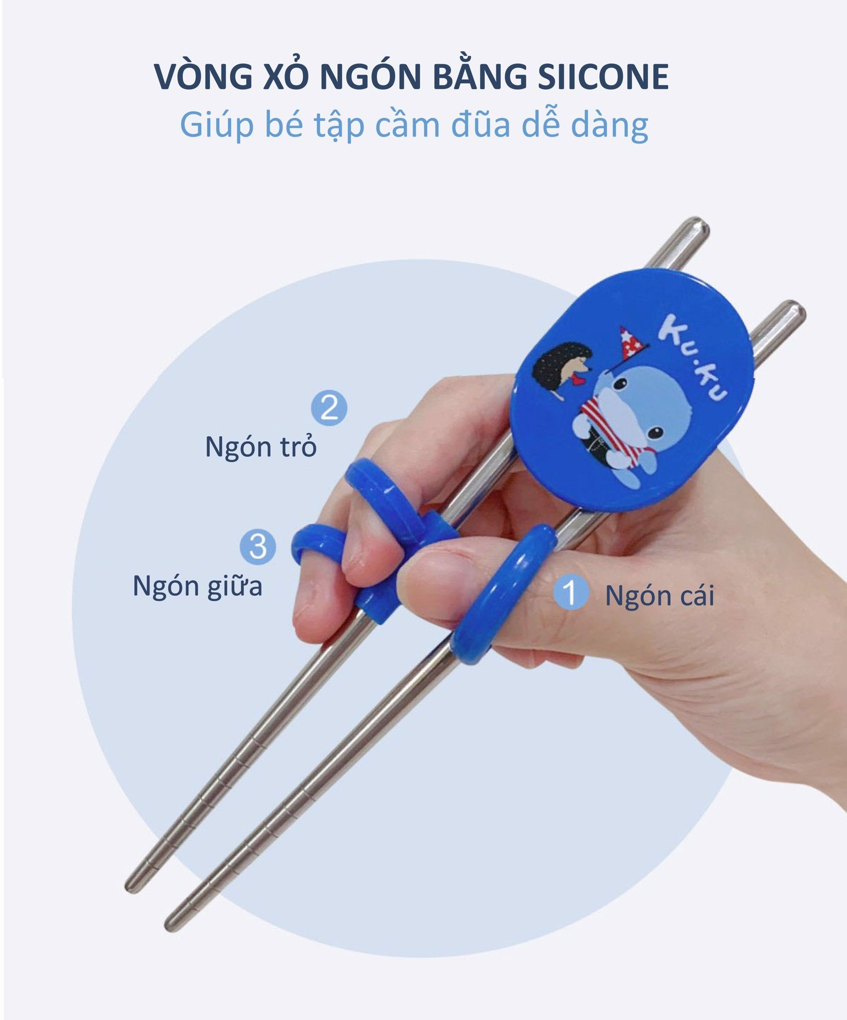 - Thiết kế đặc biệt với vòng tròn xỏ ngón bằng silicone mềm giúp tạo điểm tựa, bé cầm nắm chắc chắn, nhanh chóng làm quen với việc sử dụng đũa trong bữa ăn;