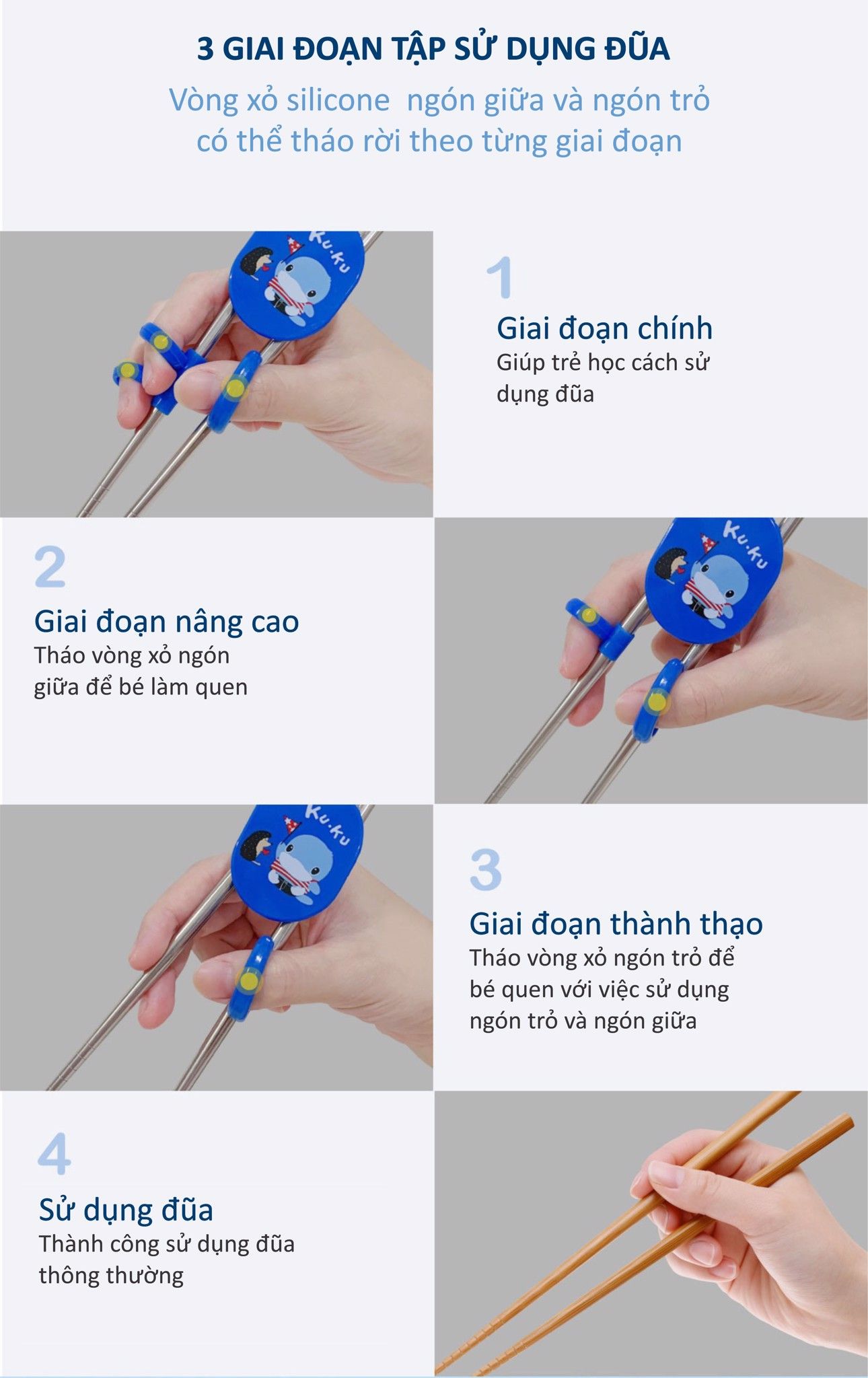 - Đũa thiết kế in hình chú vịt KuKu đáng yêu và 2 màu sắc xanh/hồng dễ thương kích thích thị giác, bé thích hơn khi sử dụng. Thành phần: Thép không gỉ 304, nhựa ABS và silicone