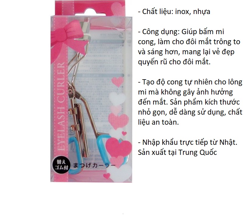 - Công dụng: Giúp bấm mi cong, làm cho đôi mắt trông to và sáng hơn, mang lại vẻ đẹp quyến rũ cho đôi mắt. Tạo độ cong tự nhiên cho lông mi mà không gây ảnh hưởng đến mắt. Sản phẩm kích thước nhỏ gọn, dễ dàng sử dụng, chất liệu an toàn