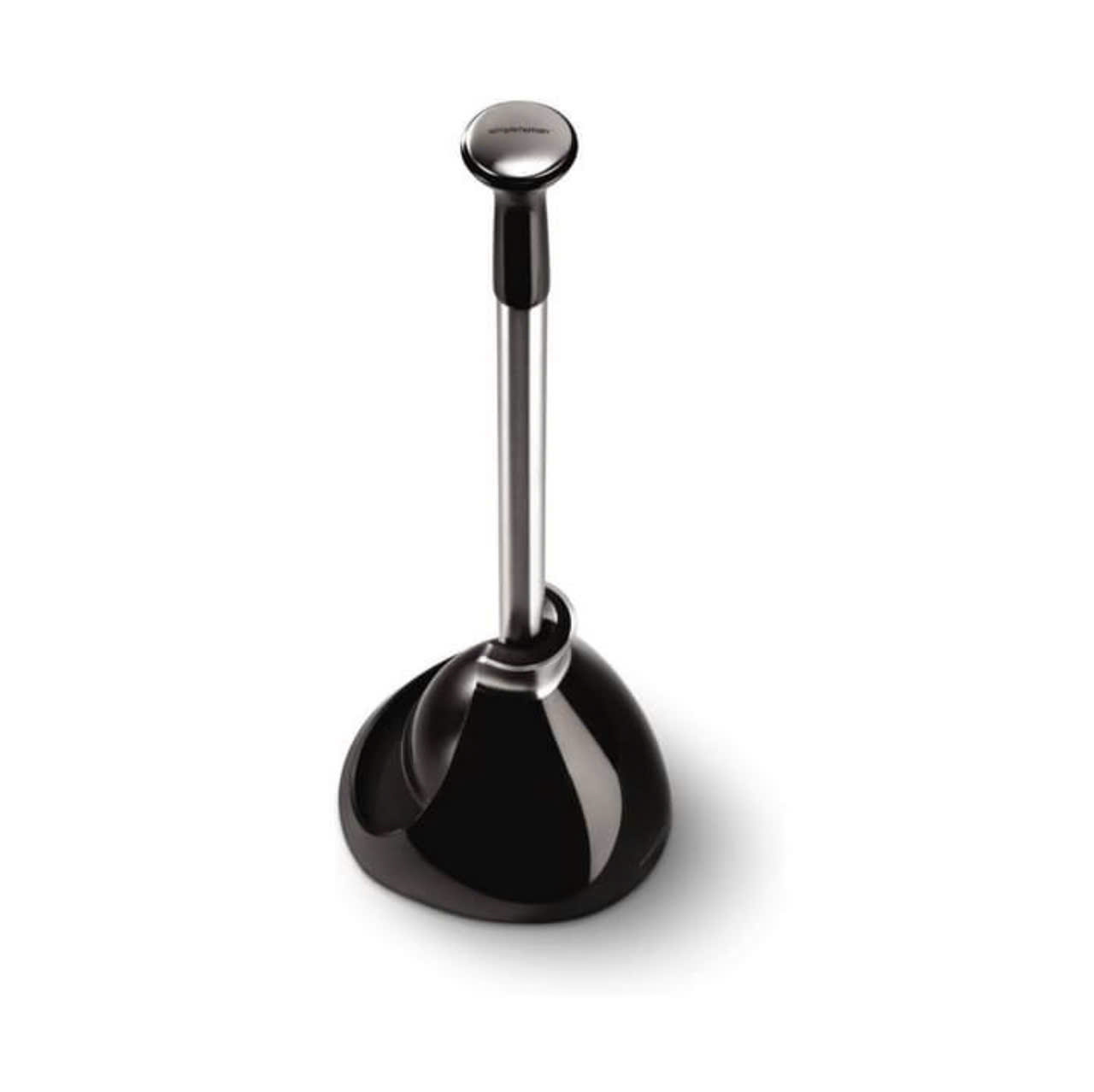 Dụng cụ thông tắc bồn cầu Simplehuman bao gồm 1 thanh pít tong và 1 giá đỡ chống nhỏ giọt Lỗ mở lớn của giá đỡ giúp pít tông dễ dàng tháo rời. Nó cũng