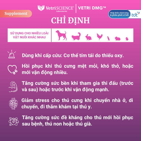 Sản phẩm Vetri DMG chứa thành phần chủ đạo là N,N-Dimethylglycine đóng vai trò như một adaptogen, mang lại hơn 40 lợi ích cho sức khỏe, đặc biệt giúp tăng cường miễn dịch và sức bền của thú cưng.