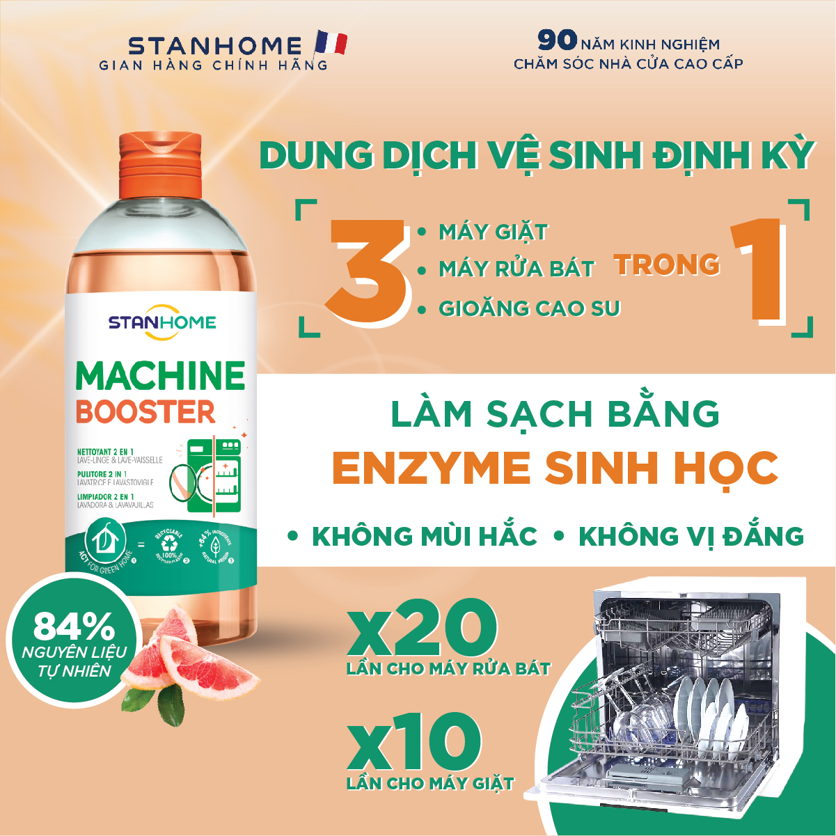 - Công nghệ khử mùi độc quyền nhà Stanhome giúp loại bỏ hoàn toàn mùi khó chịu thường thấy trong máy rửa chén và lồng giặt. Lưu lại hương đào và táo xanh thơm mát. Giúp bạn cảm nhận ngay tức thì lồng giặt và máy rửa chén sạch và thơm mát khi được vệ sinh sạch xong với dung dịch vệ sinh Machine Booster.