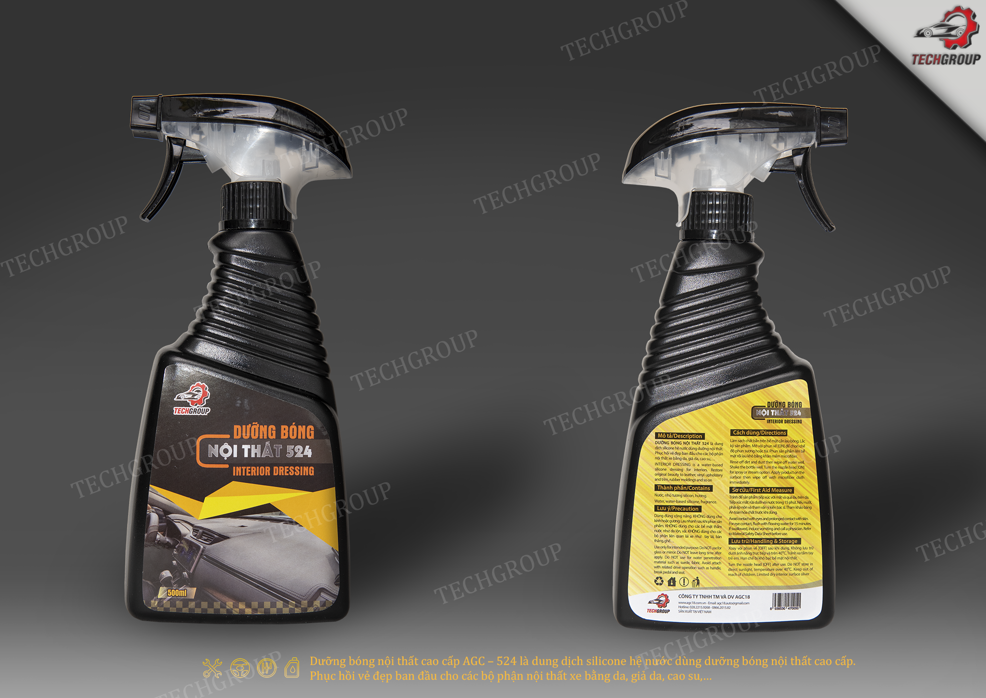 Mua tại TiktokDưỡng bóng nội thất cao cấp Techgroup - 524 là dung dịch silicone hệ nước dùng dưỡng bóng nội thất cao cấp. Phục hồi vẻ đẹp ban đầu cho các bộ phận nội thất xe bằng da, giả da, cao su,… 1. Hướng dẫn sử dụng : Làm sạch chất bẩn trên bề mặt cần lau bóng. Lắc kỹ sản phẩm. Mở vòi phun về [ON] để chọn chế độ phun sương hoặc tia. Phun sản phẩm lên bề mặt rồi lau khô bằng khăn mềm microfiber. 2. Thành phần : Nước, nhũ tương silicon, hương. 3. Sơ Cứu :