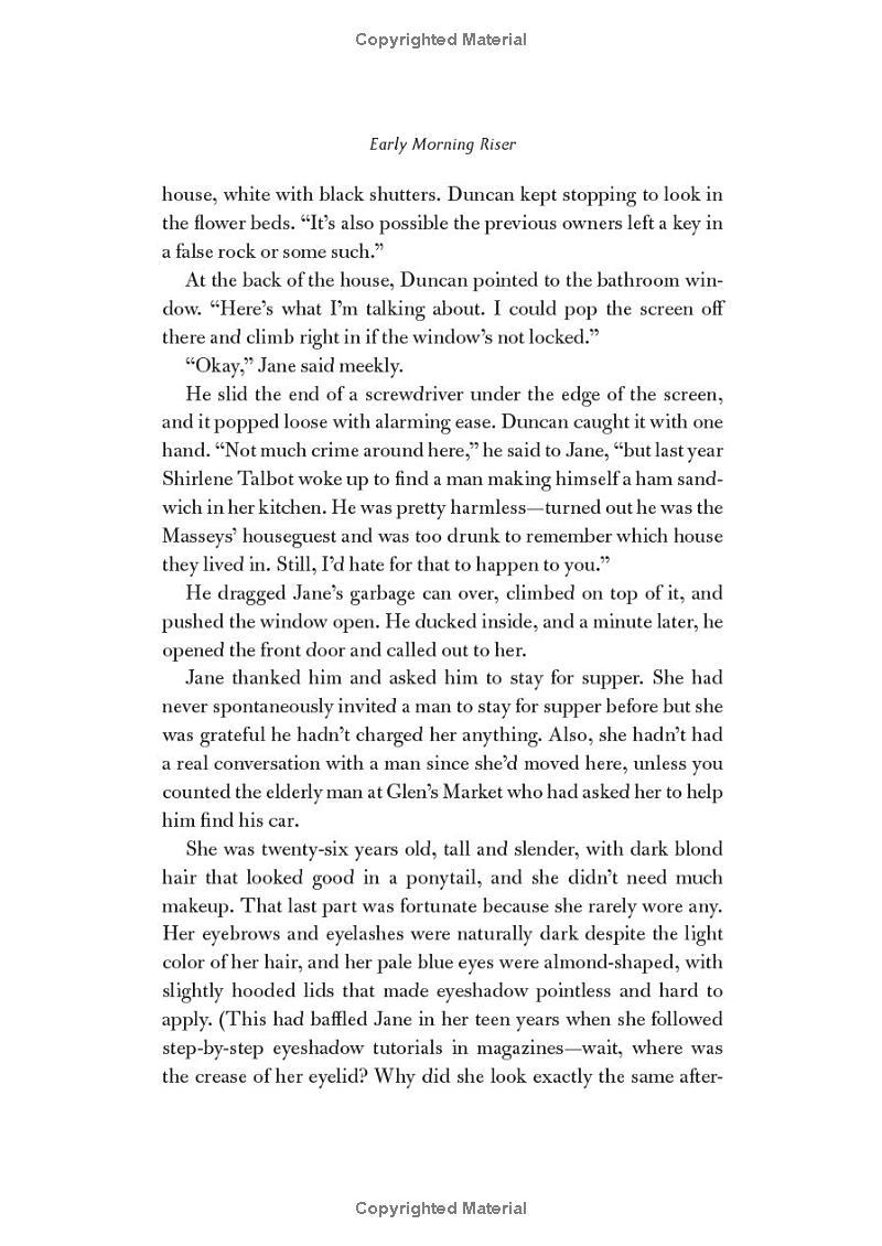 But he has also slept with nearly every woman in Boyne City. Jane sees Duncan's old girlfriends everywhere – at restaurants, at the grocery store and his ex-wife, Aggie, still has him mow her lawn.