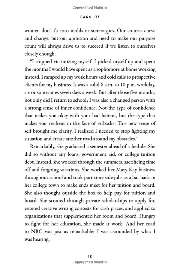 The whirlwind of job applications, interviews, follow-up, resume building, and networking is just the beginning. What happens after you've landed the job, settled in, and begun to make a difference-where do you go from here? What if you feel stuck in what you thought would be your dream profession? New York Times bestselling author Mika Brzezinski and producer Daniela Pierre-Bravo provide an essential manual for those crucial next steps. Earn It! is a practical career guidebook that not only helps you get your foot in the door; it also shows you how to negotiate a raise, advocate for more responsibility, and figure out whether you're in the career that's right for you.