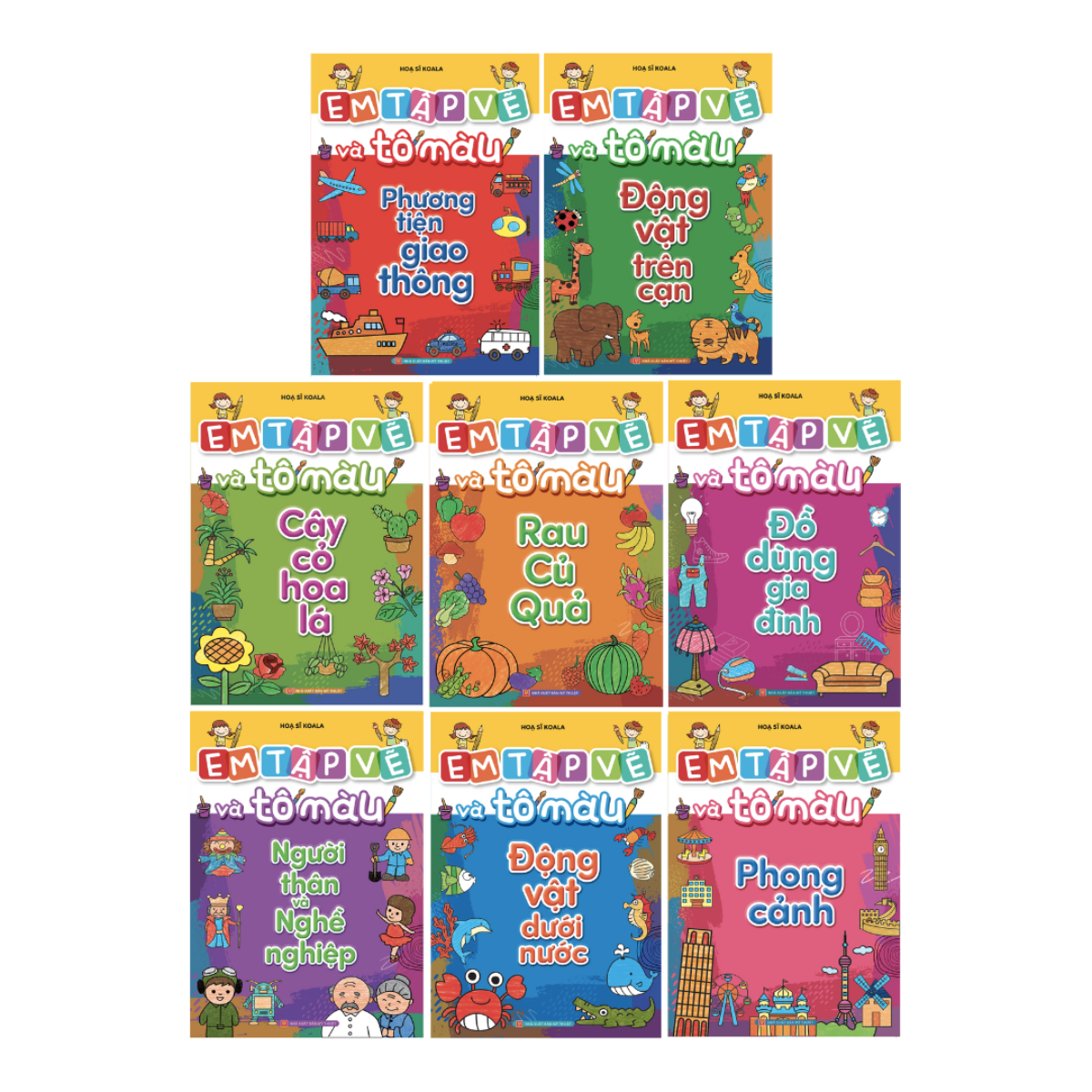 Tinh Hoa Book xin giới thiệu tới bố mẹ và các bé bộ túi “EM TẬP VẼ VÀ TÔ MÀU” gồm 8 cuốn với 8 chủ đề như sau: