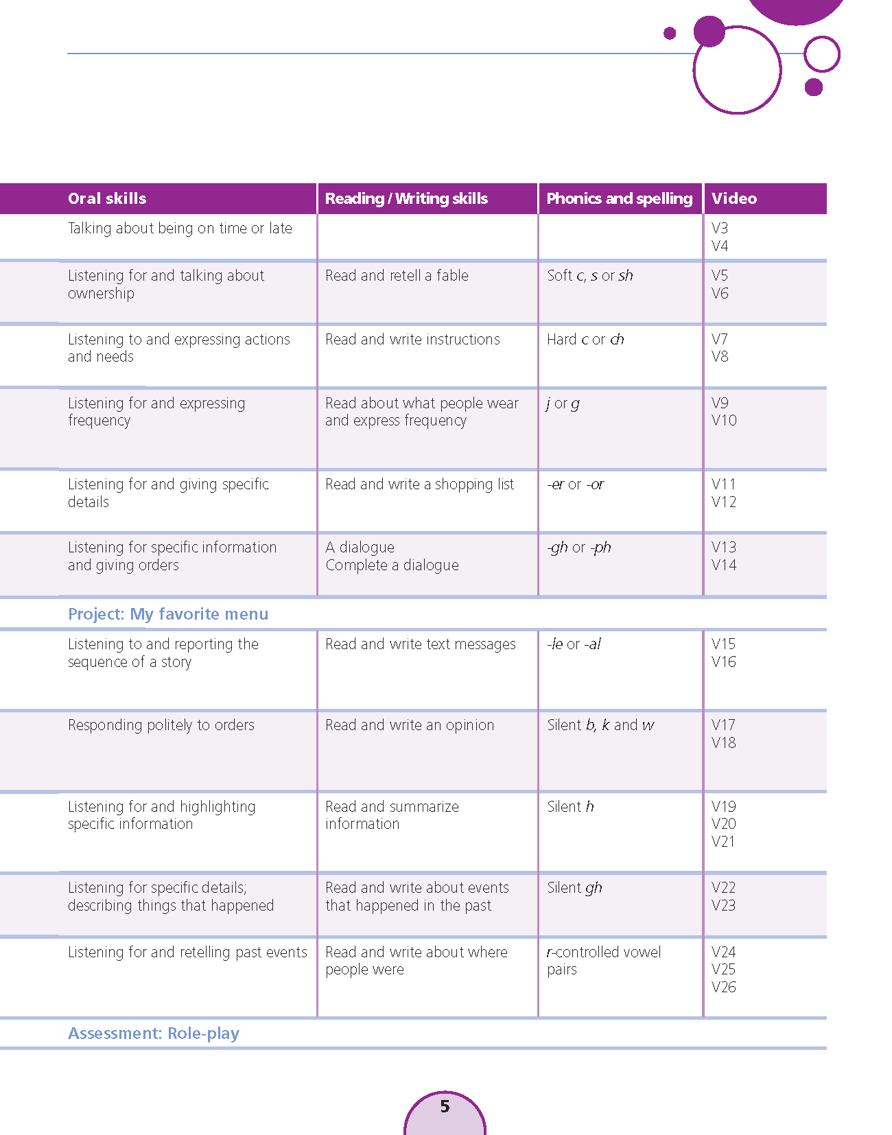 Sách: Learning English 5 - Dành Cho Học Sinh Lớp 5 NỘI DUNG VÀ CẤU TRÚC CỦA QUYỂN SÁCH : Bảng mục lục: Chỉ rõ các mục tiêu chính và trọng tâm của mỗi bài